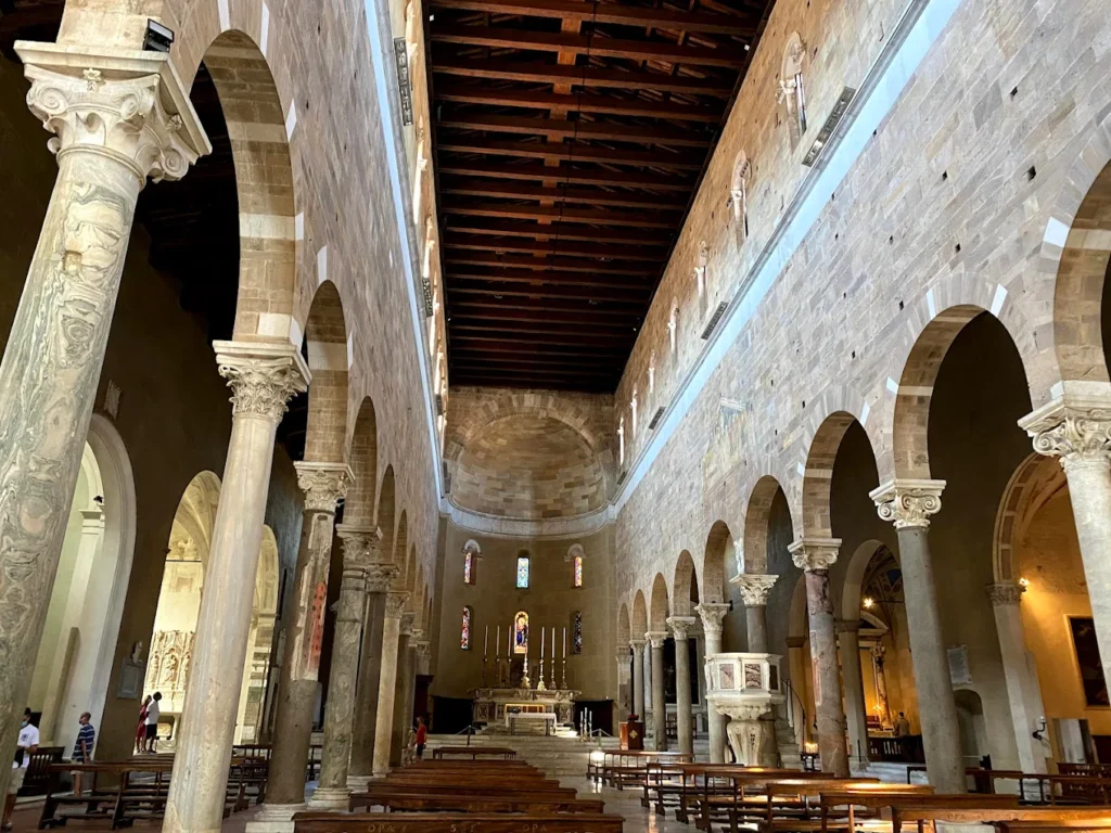 Ancient columns, many repurposed from earlier Roman structures, line the main nave and create continuity between classical antiquity and the medieval church. In addition, the 12th-century baptismal font stands out as it is decorated with detailed carvings that depict various biblical scenes.