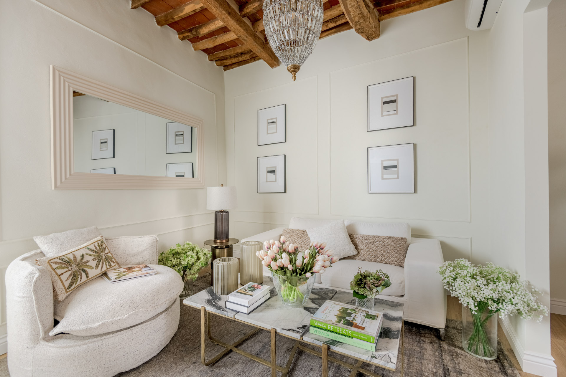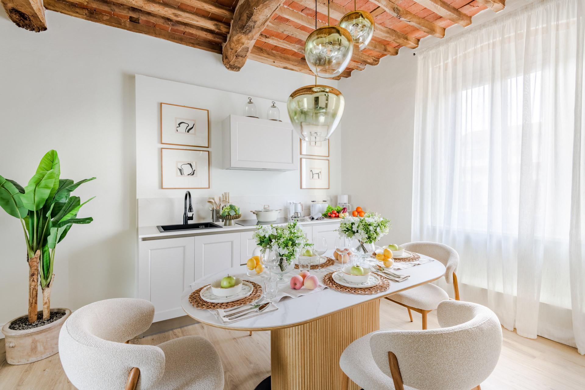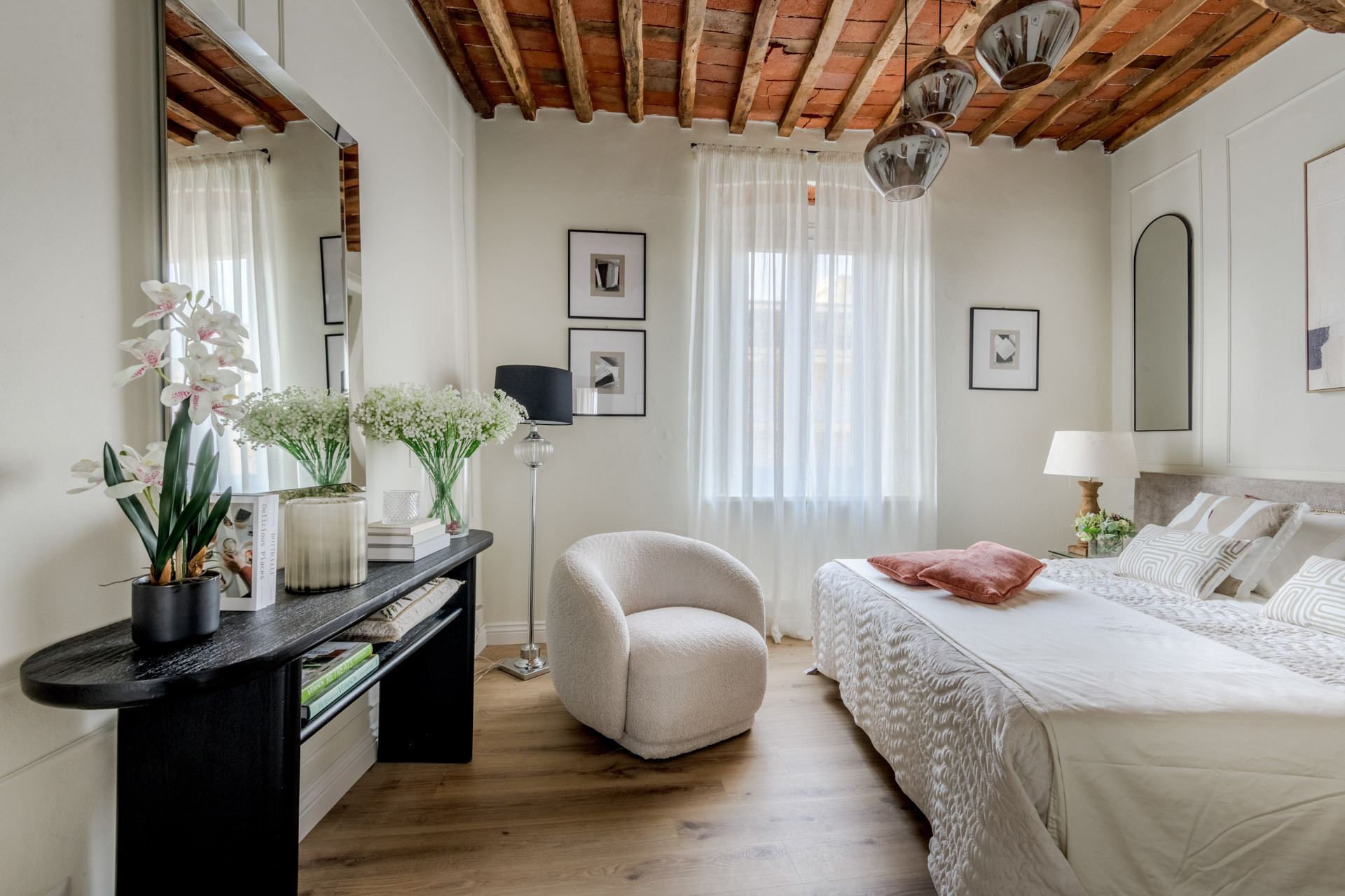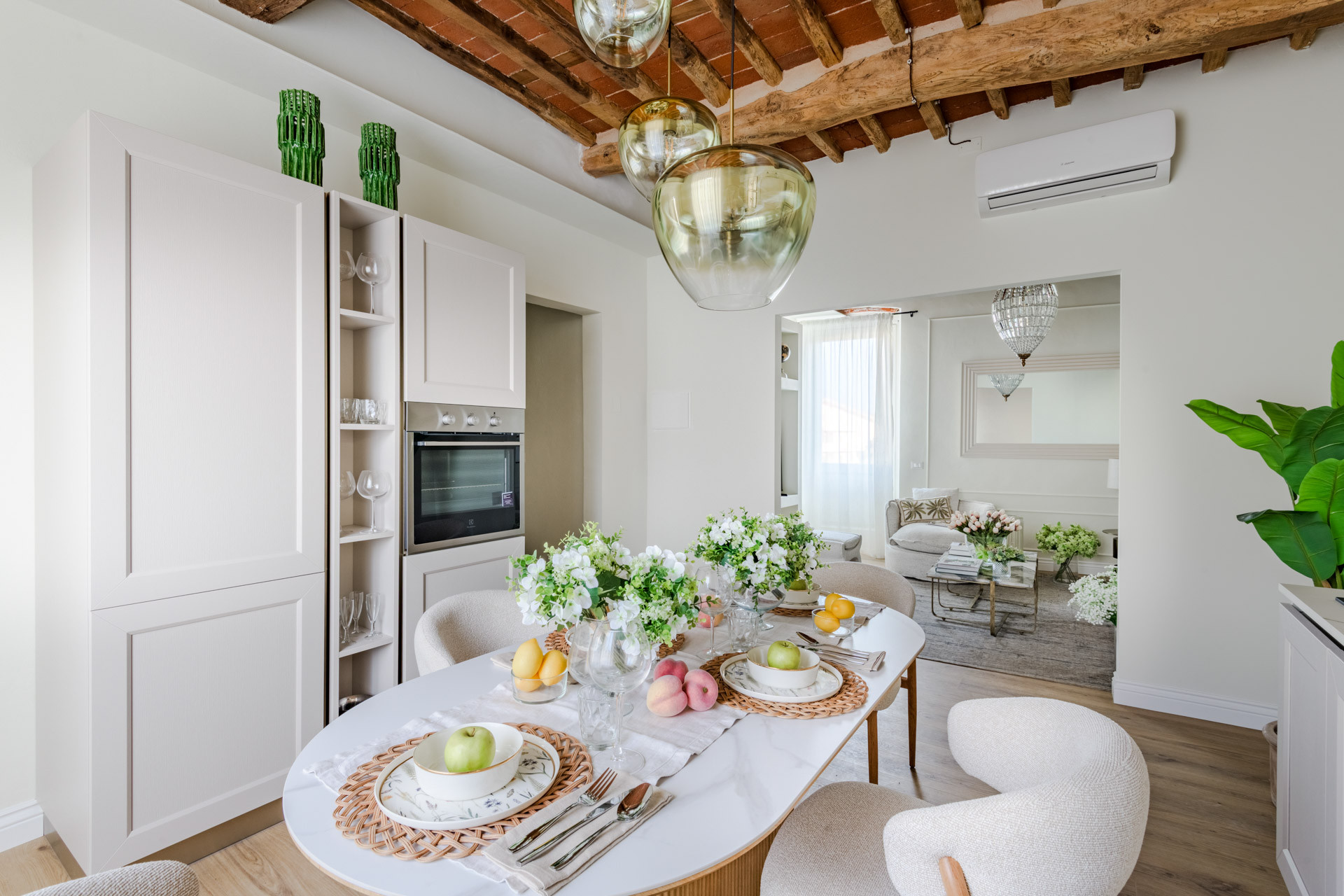 Named for its timeless appeal, Casa Antonello has been completely transformed through a meticulous renovation. The apartment honors its architectural roots with soaring exposed timber beams and original terracotta ceilings, providing a warm, tactile contrast to the crisp, white-walled minimalism of the living spaces.