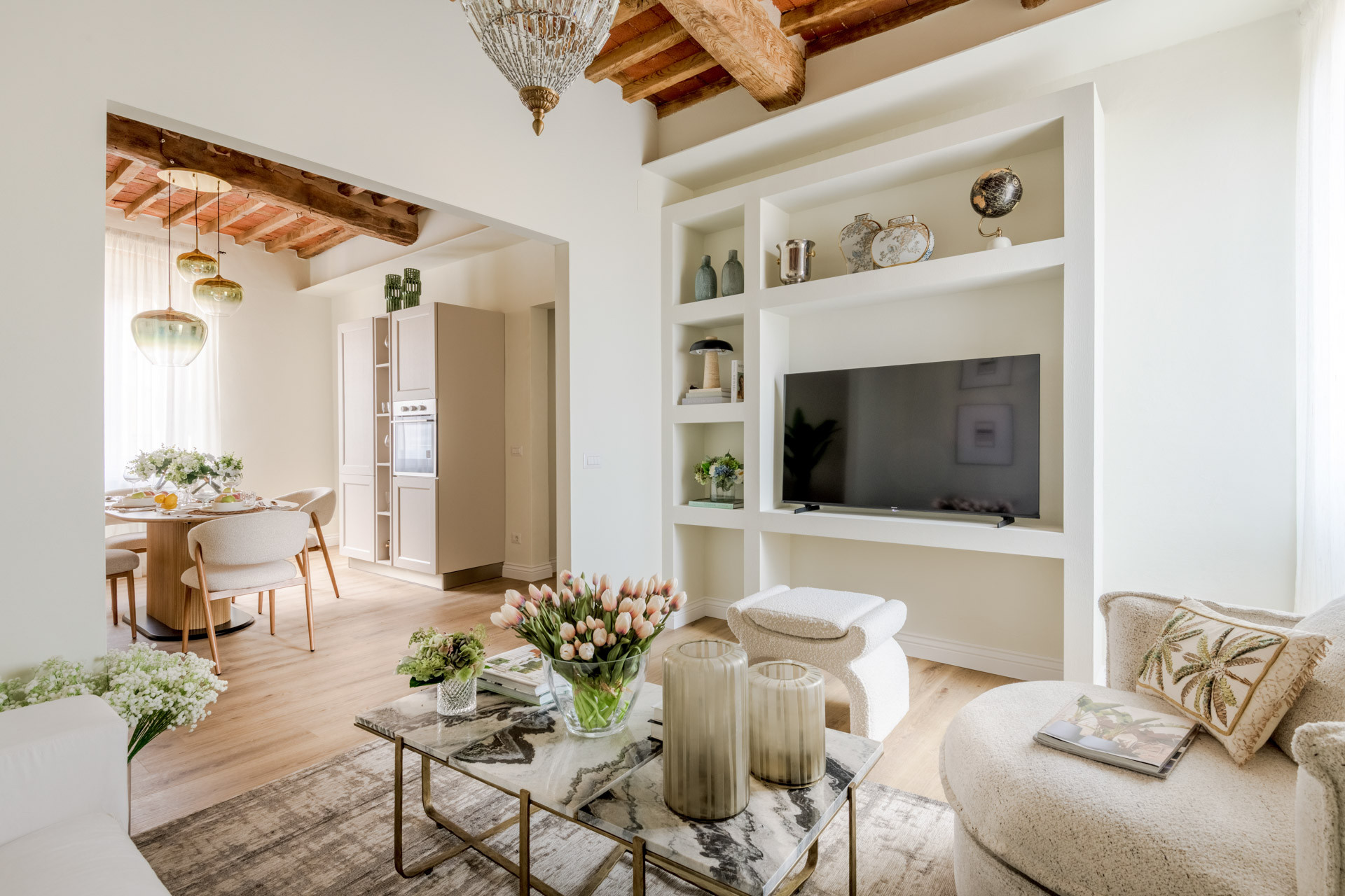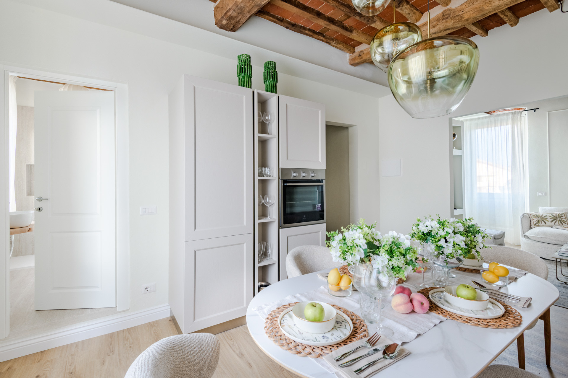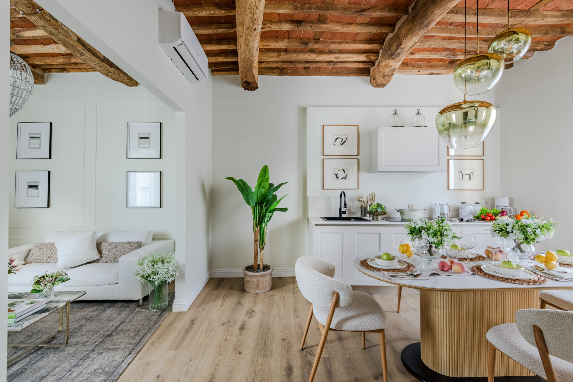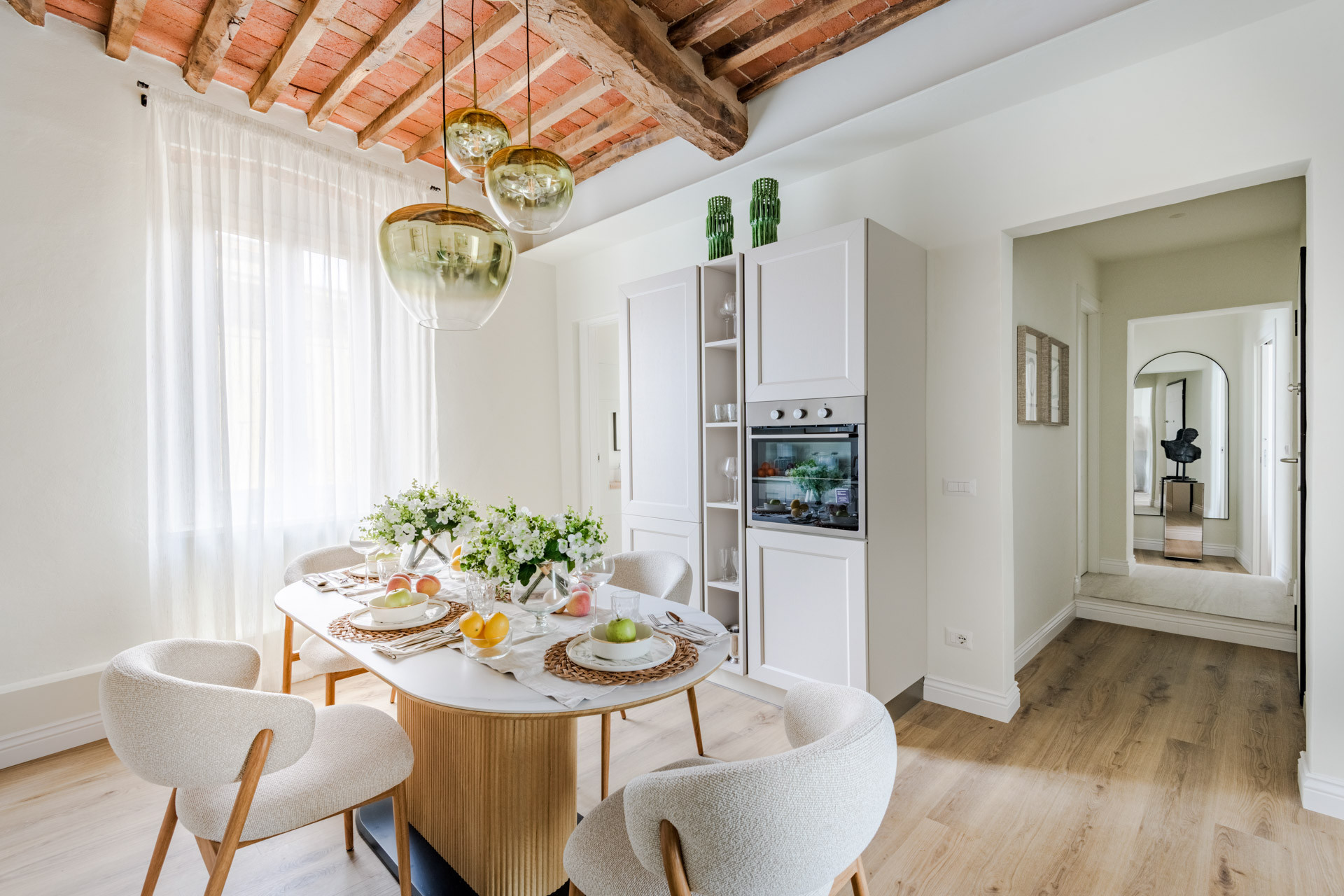 Named for its timeless appeal, Casa Antonello has been completely transformed through a meticulous renovation. The apartment honors its architectural roots with soaring exposed timber beams and original terracotta ceilings, providing a warm, tactile contrast to the crisp, white-walled minimalism of the living spaces.