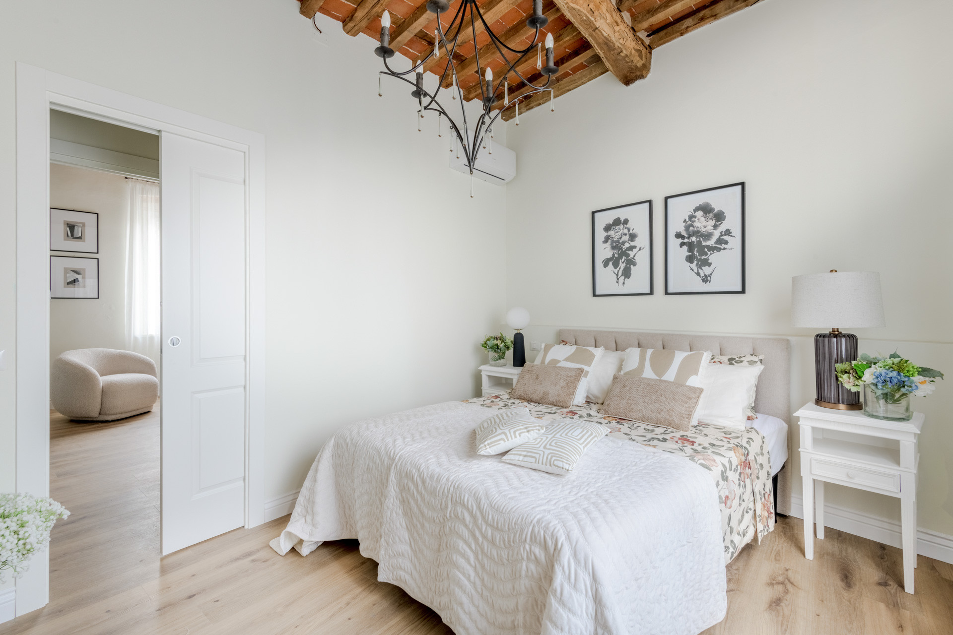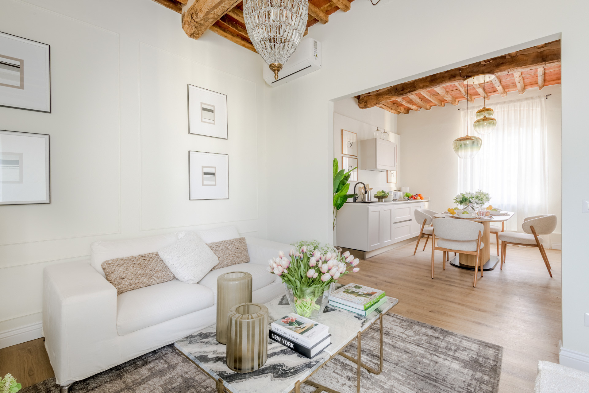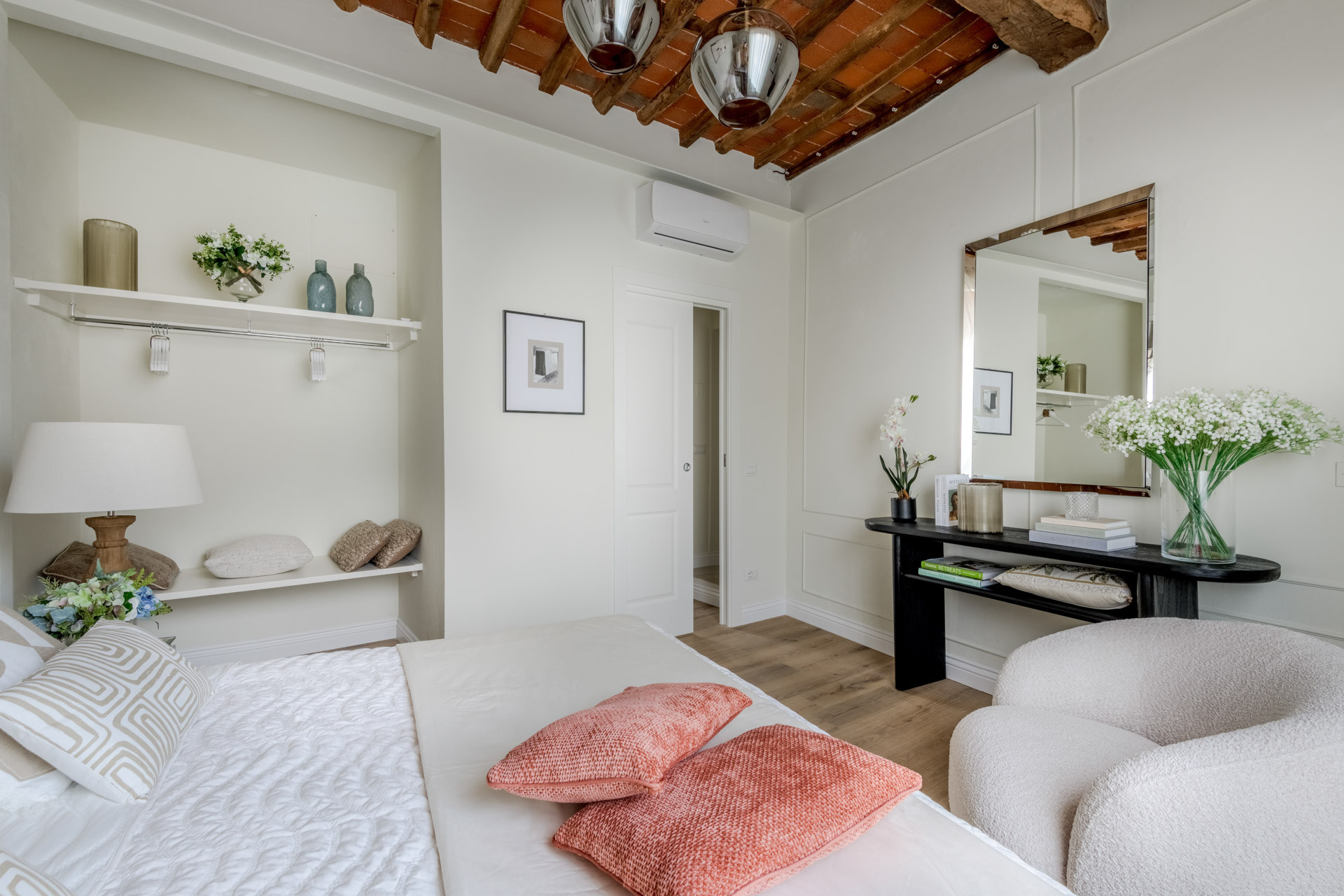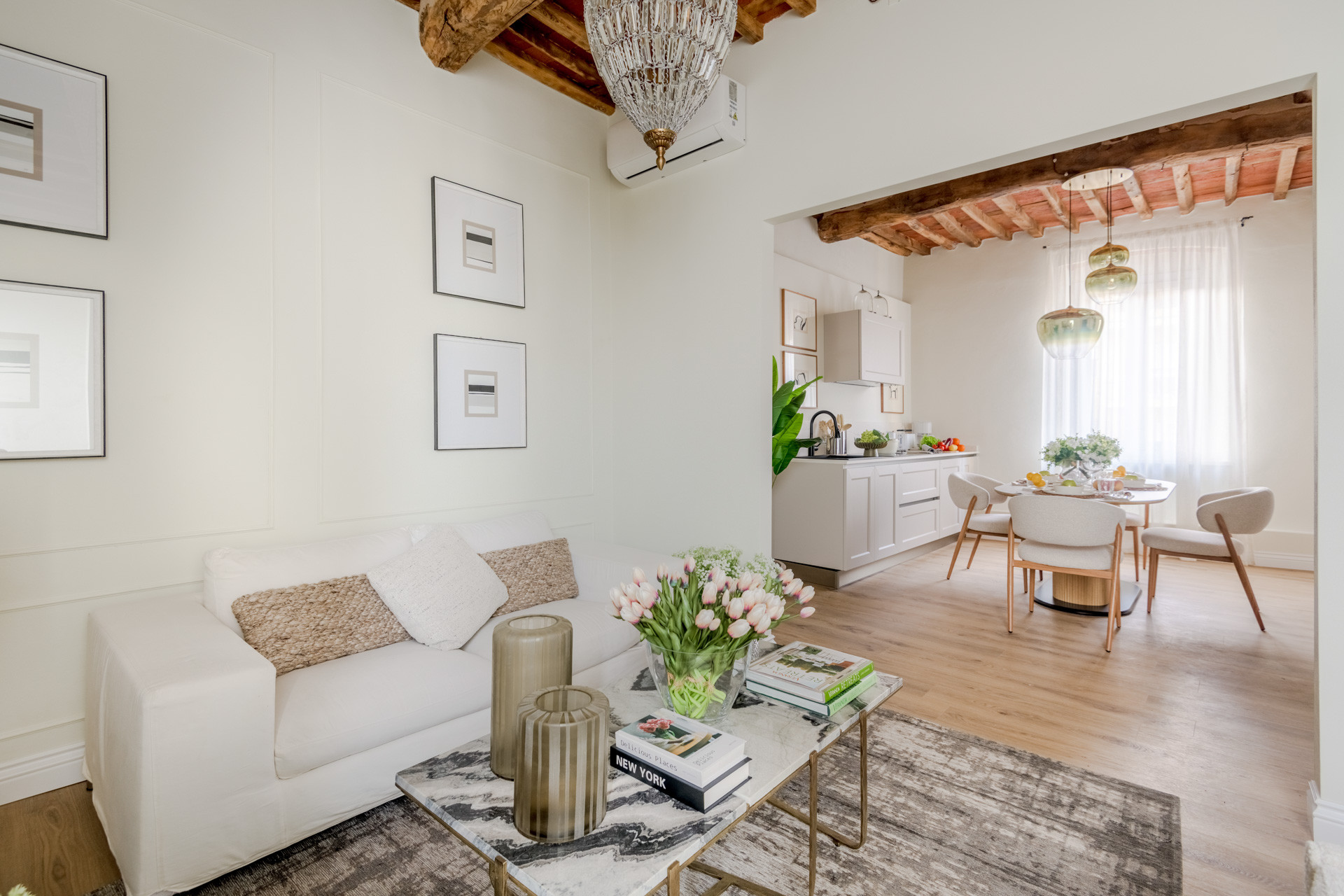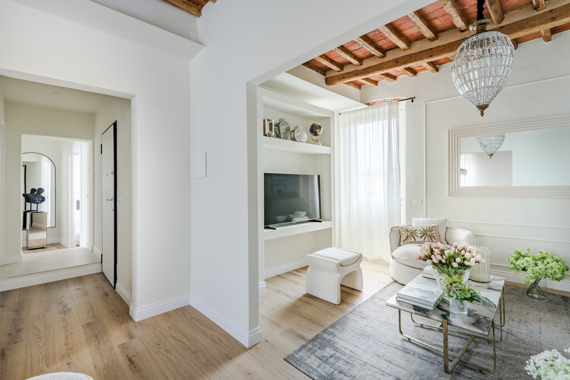 Named for its timeless appeal, Casa Antonello has been completely transformed through a meticulous renovation. The apartment honors its architectural roots with soaring exposed timber beams and original terracotta ceilings, providing a warm, tactile contrast to the crisp, white-walled minimalism of the living spaces.
