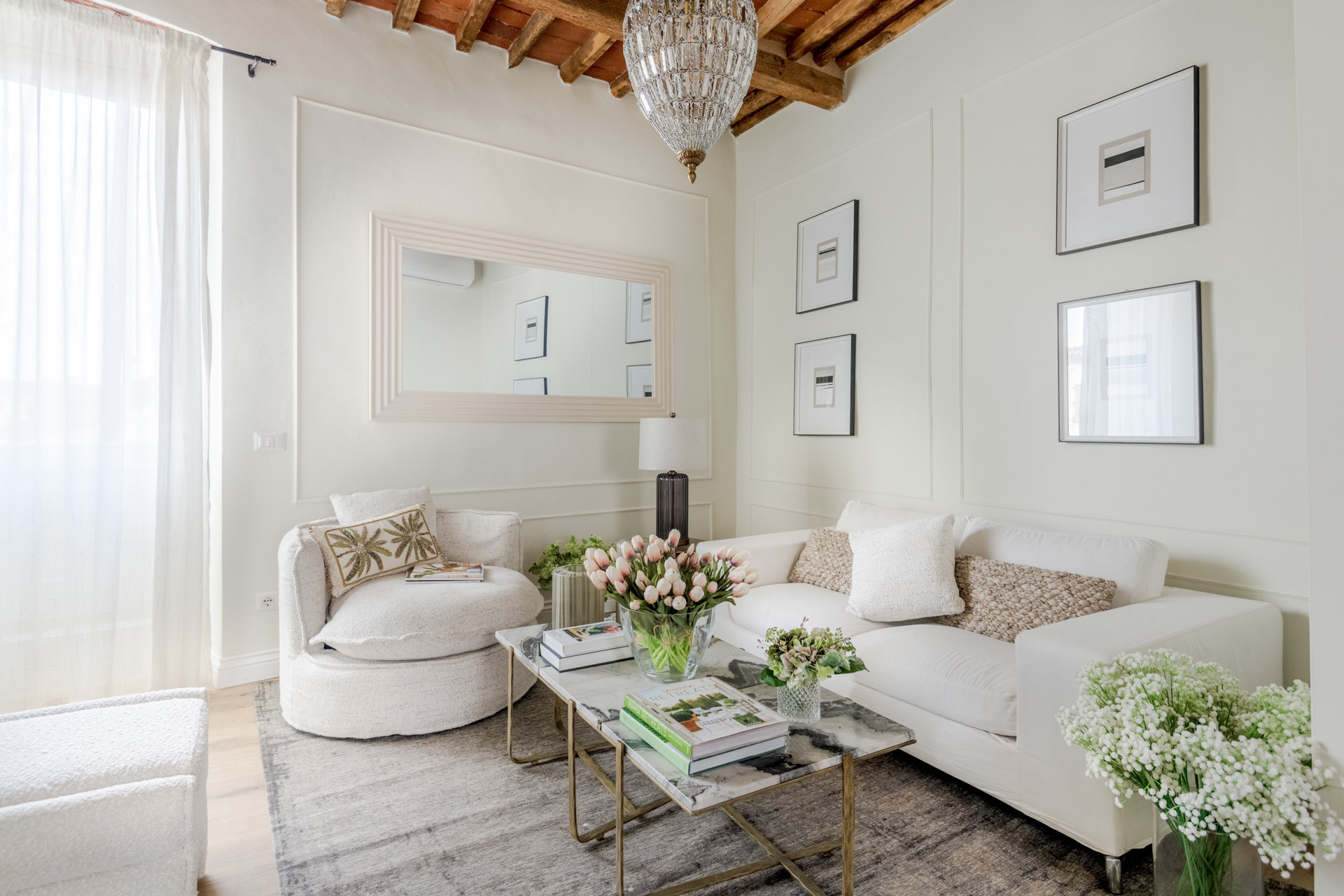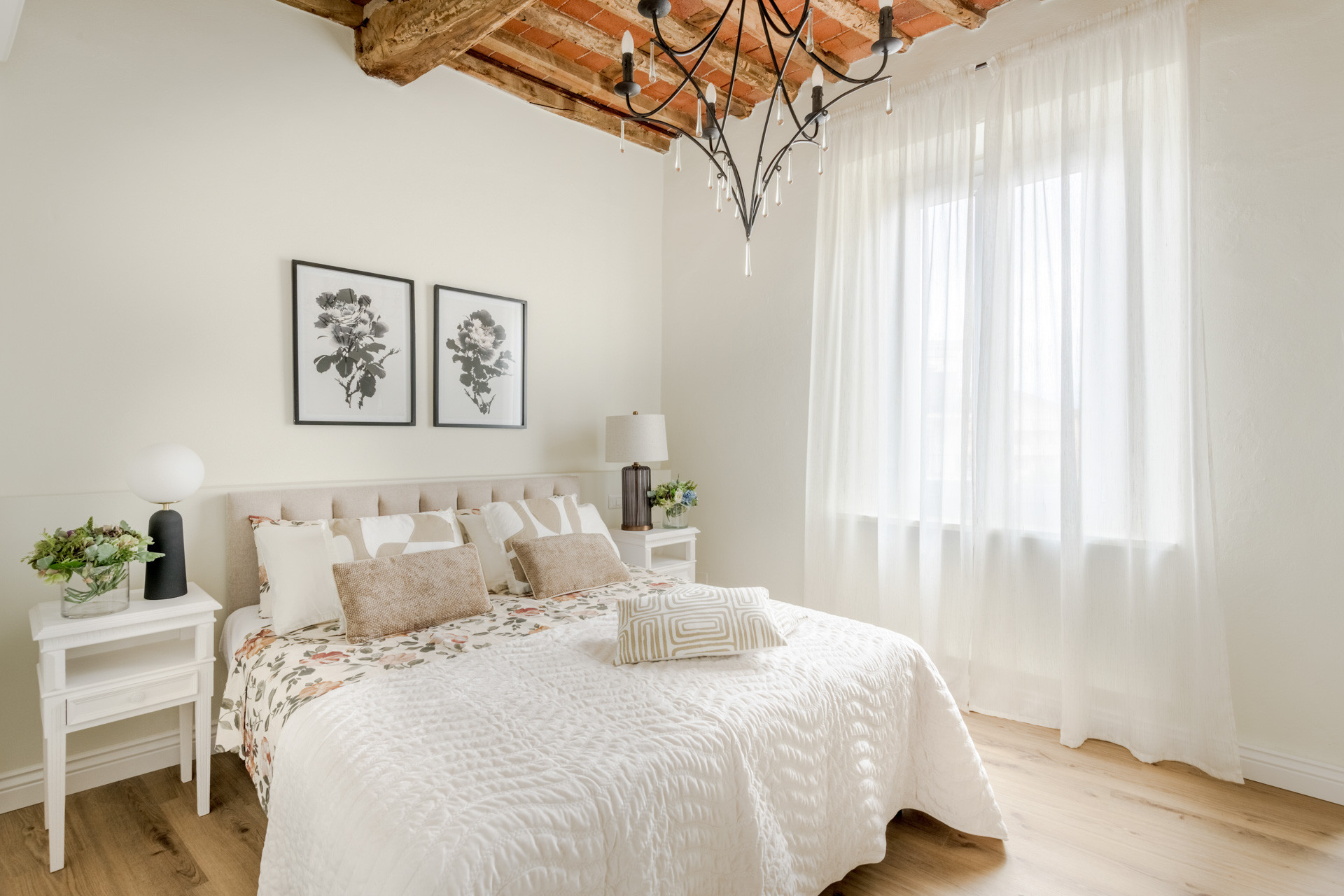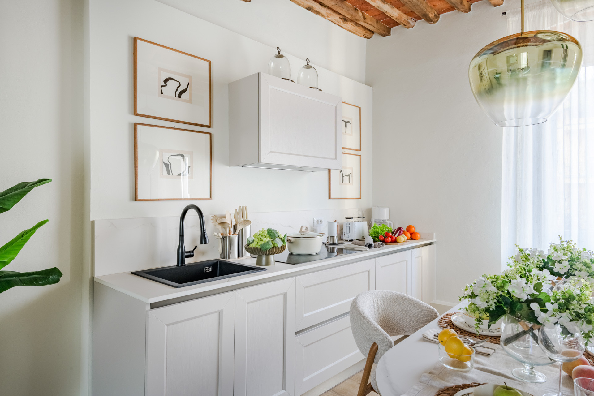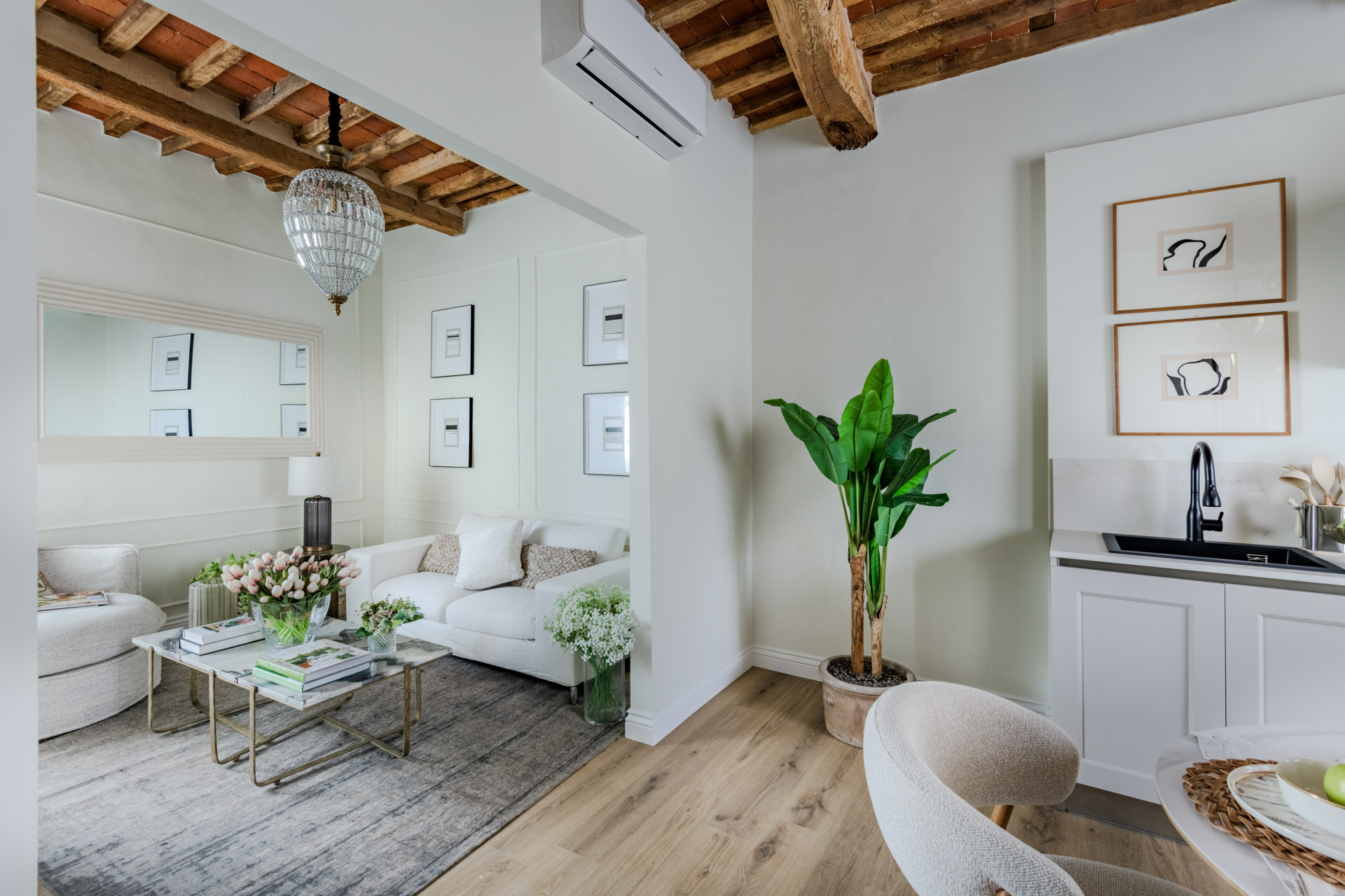 Named for its timeless appeal, Casa Antonello has been completely transformed through a meticulous renovation. The apartment honors its architectural roots with soaring exposed timber beams and original terracotta ceilings, providing a warm, tactile contrast to the crisp, white-walled minimalism of the living spaces.
