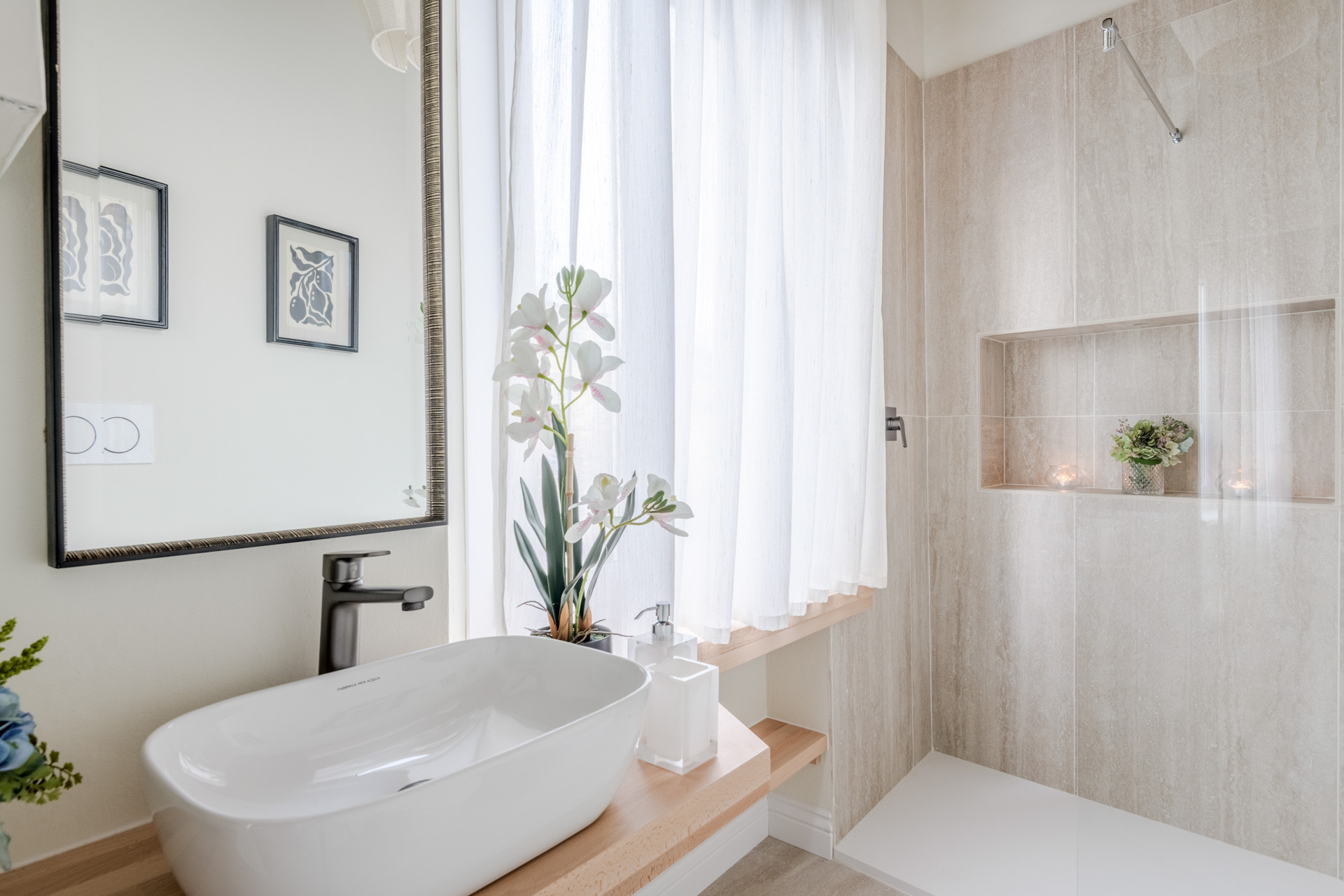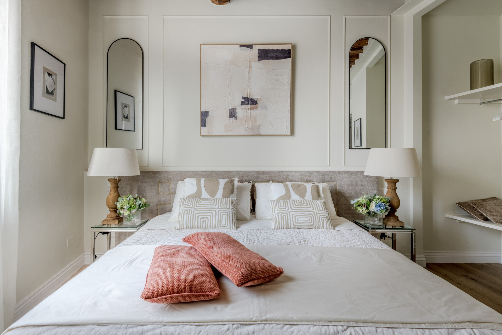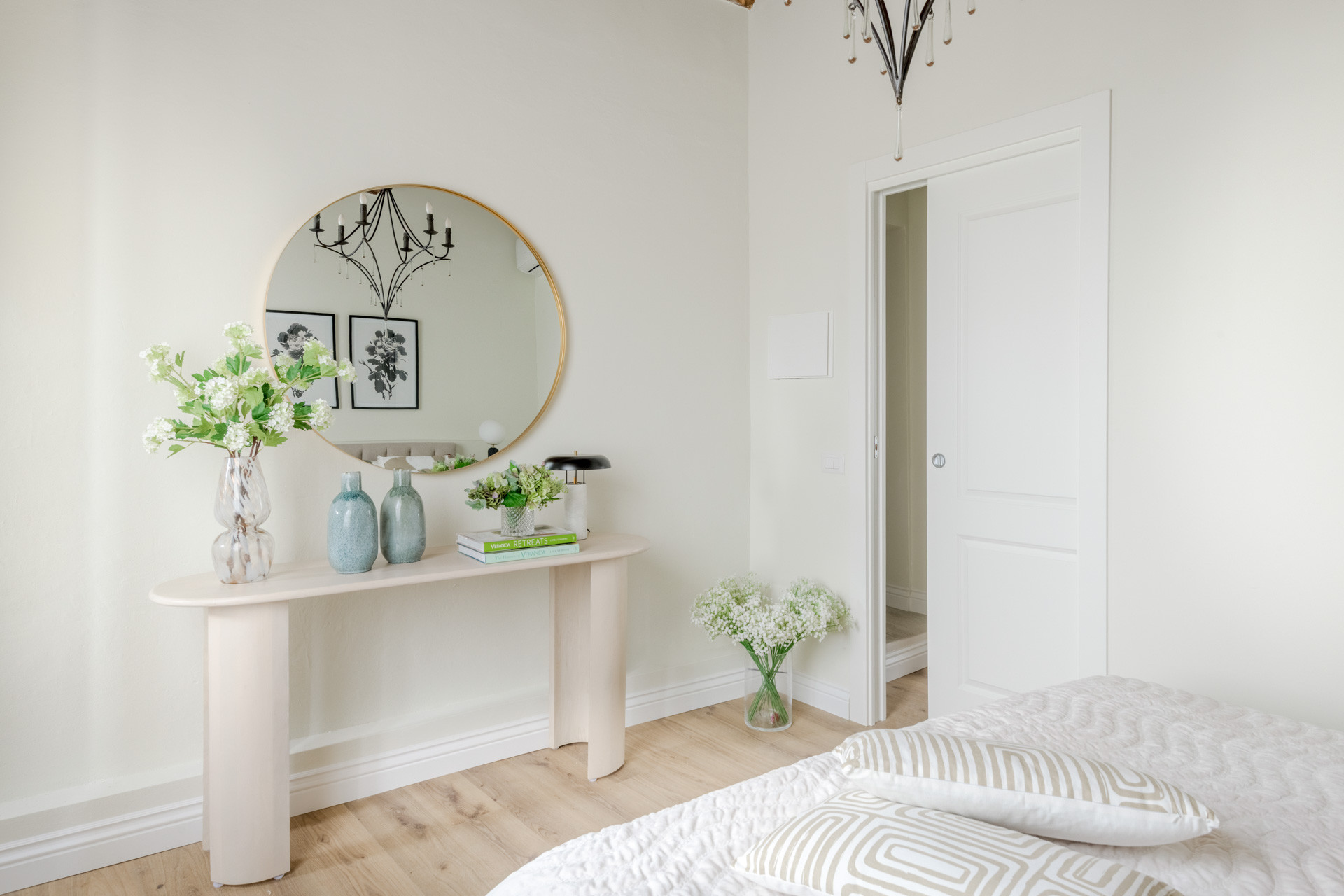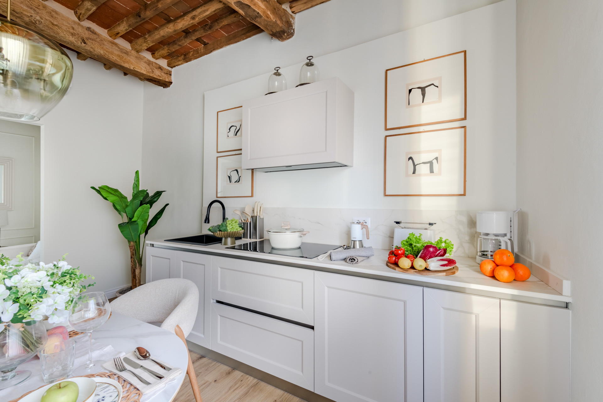 Named for its timeless appeal, Casa Antonello has been completely transformed through a meticulous renovation. The apartment honors its architectural roots with soaring exposed timber beams and original terracotta ceilings, providing a warm, tactile contrast to the crisp, white-walled minimalism of the living spaces.
