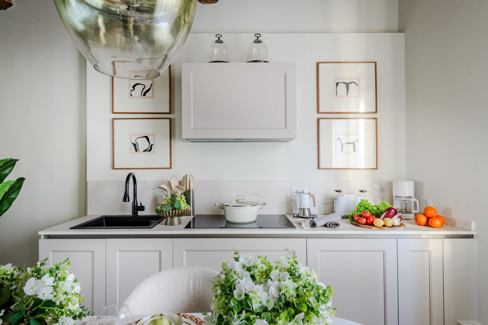The Culinary Heart: A bright, open-plan kitchen and dining area features sleek cabinetry, a statement marble-topped table, and sculptural lighting—perfect for hosting intimate dinners inspired by the local markets.