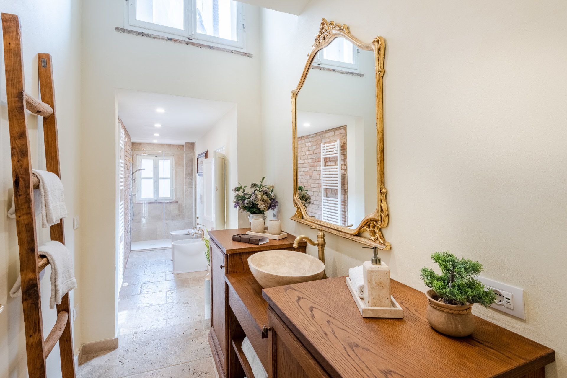 Stylish bathroom with stone finishes, large shower and premium amenities