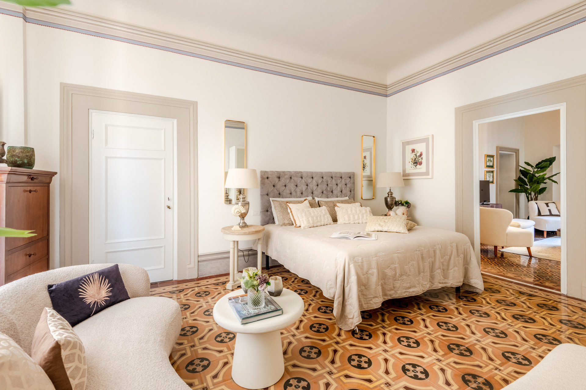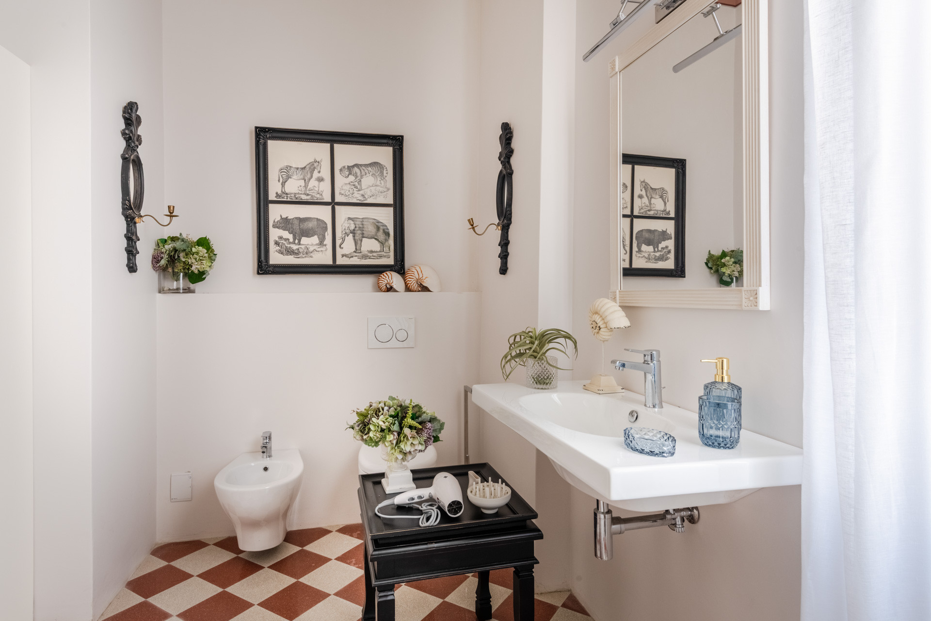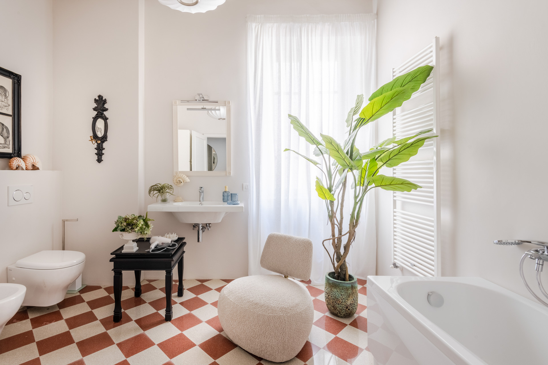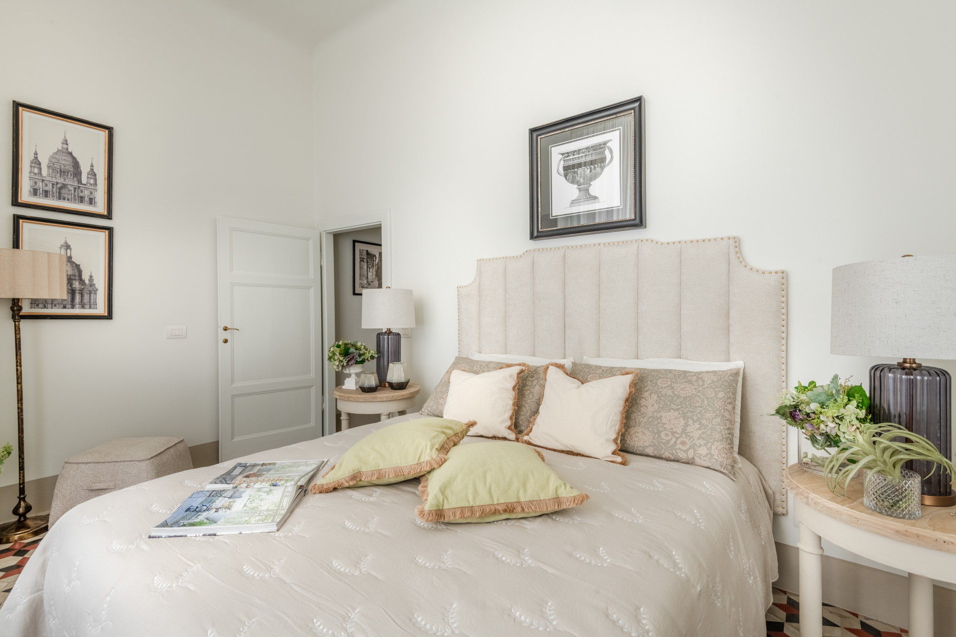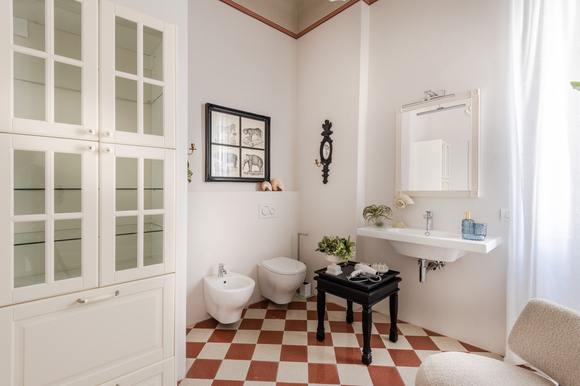 The apartment features three double bedrooms, each thoughtfully decorated with a touch of classic Italian elegance. One of the bedrooms boasts an exquisite frescoed ceiling, an authentic reminder of the home’s noble past.