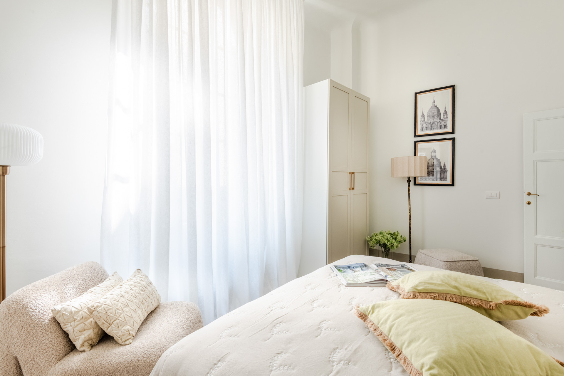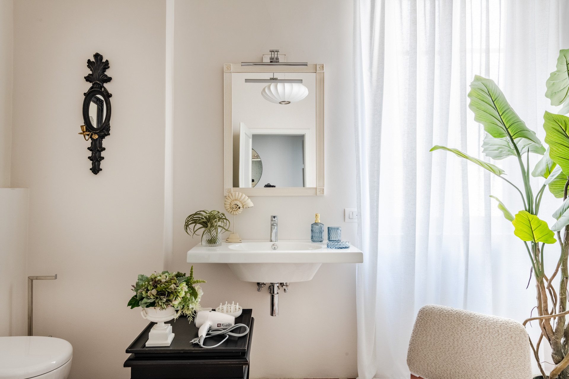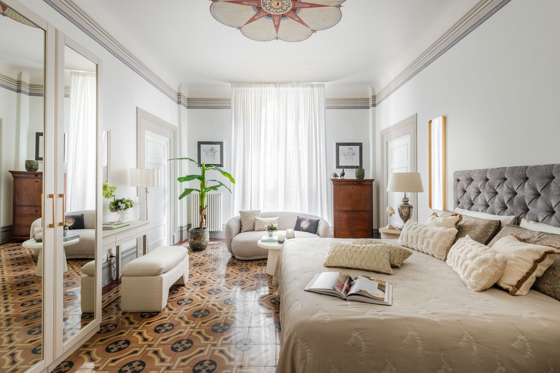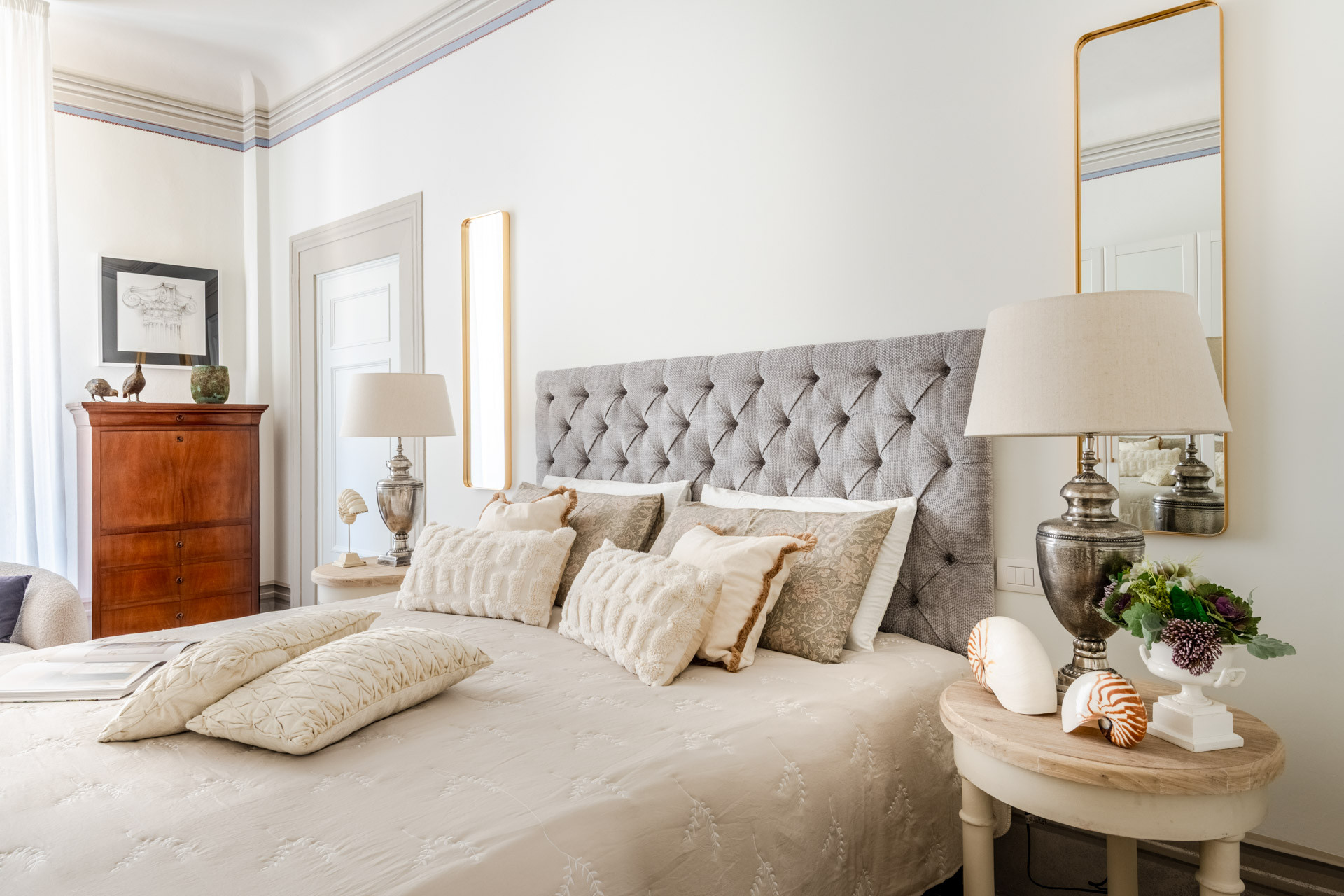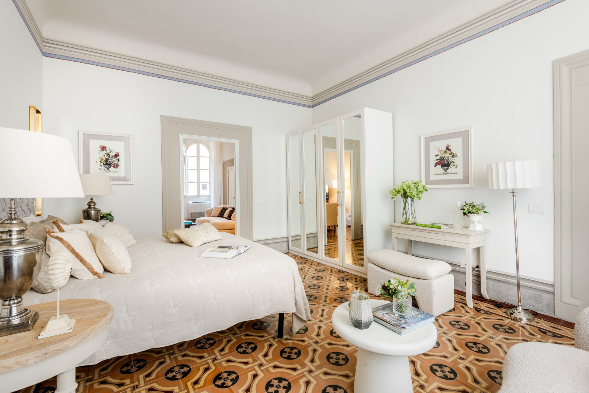 The apartment features three double bedrooms, each thoughtfully decorated with a touch of classic Italian elegance. One of the bedrooms boasts an exquisite frescoed ceiling, an authentic reminder of the home’s noble past.