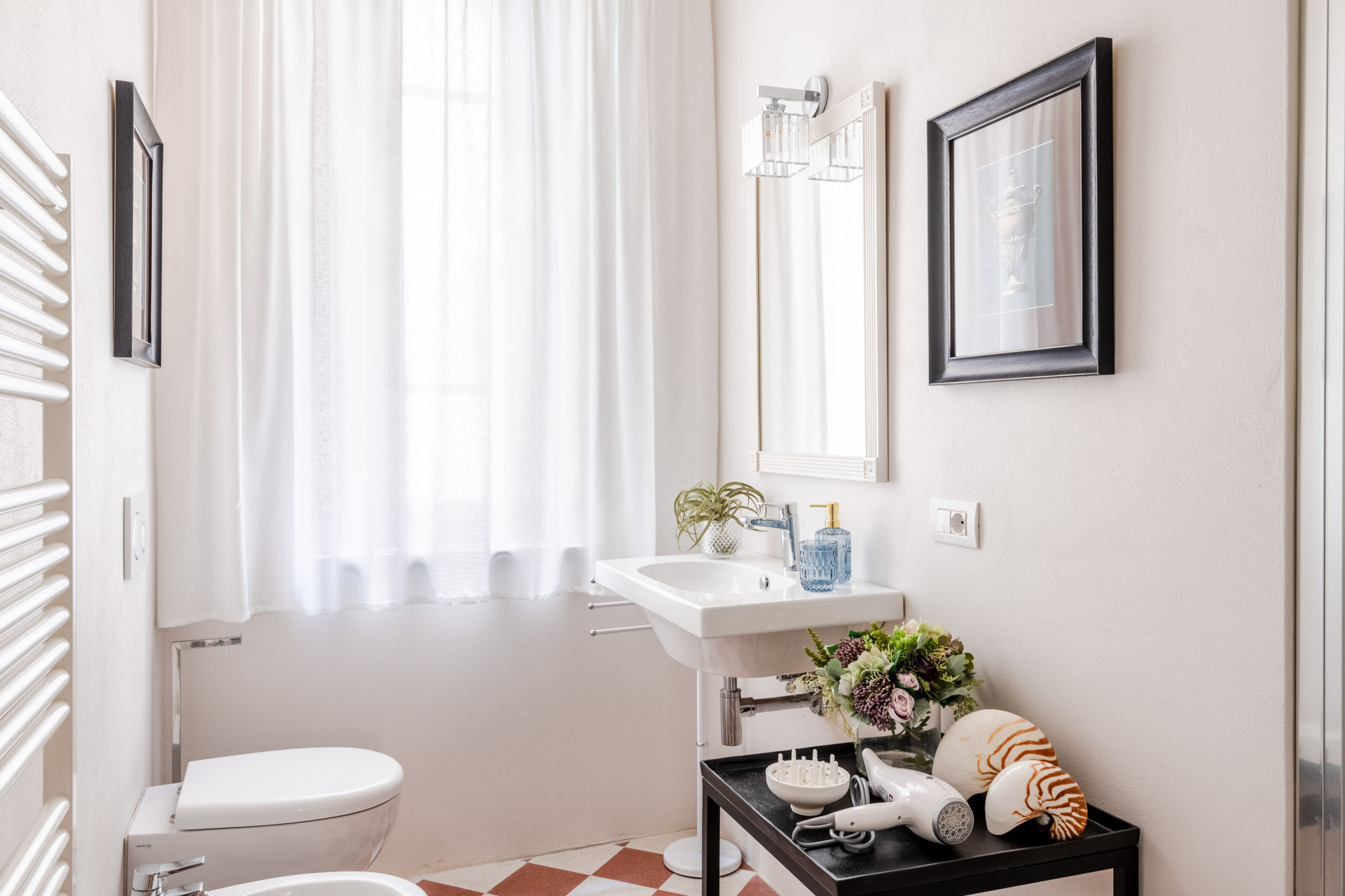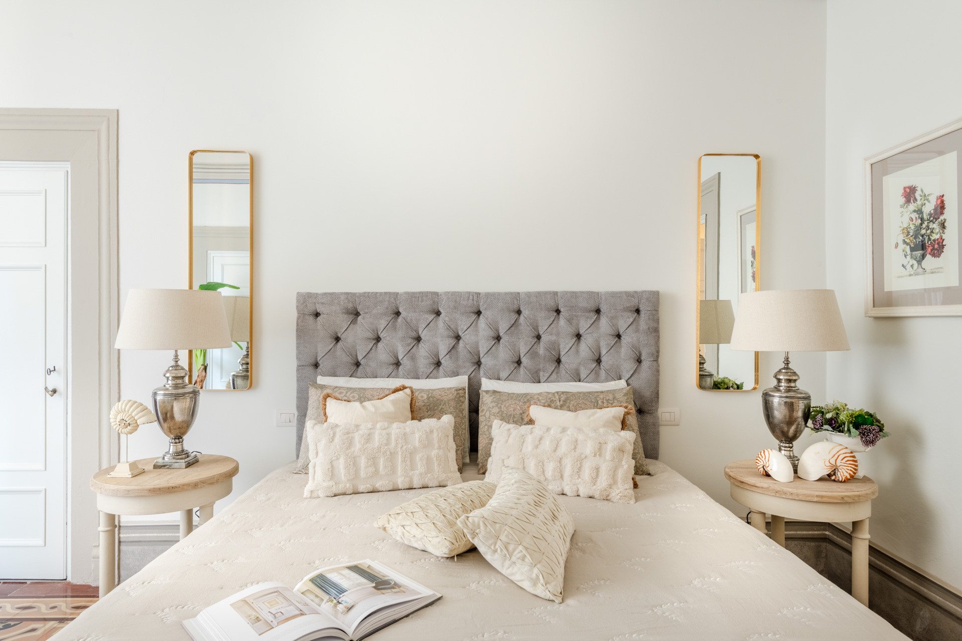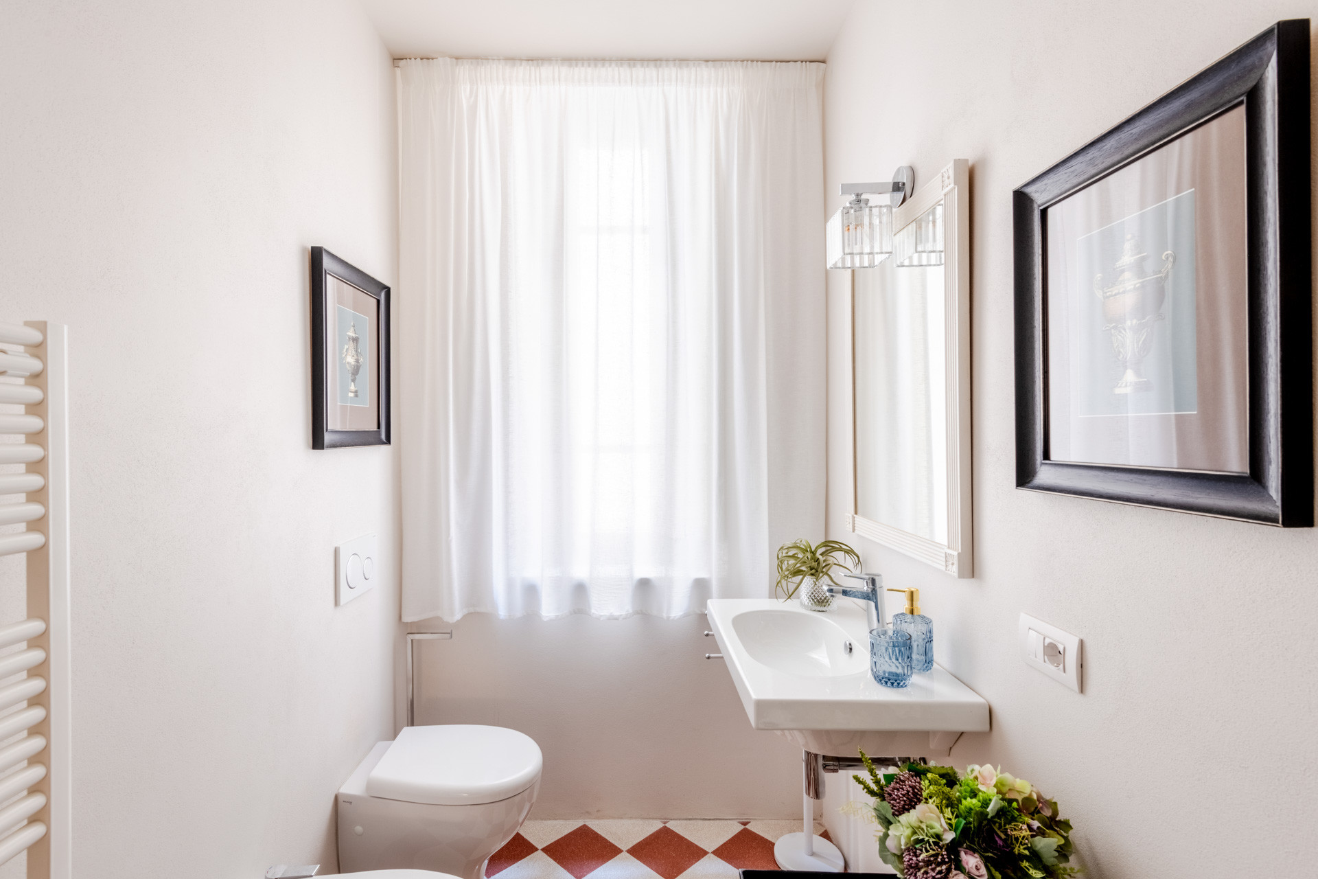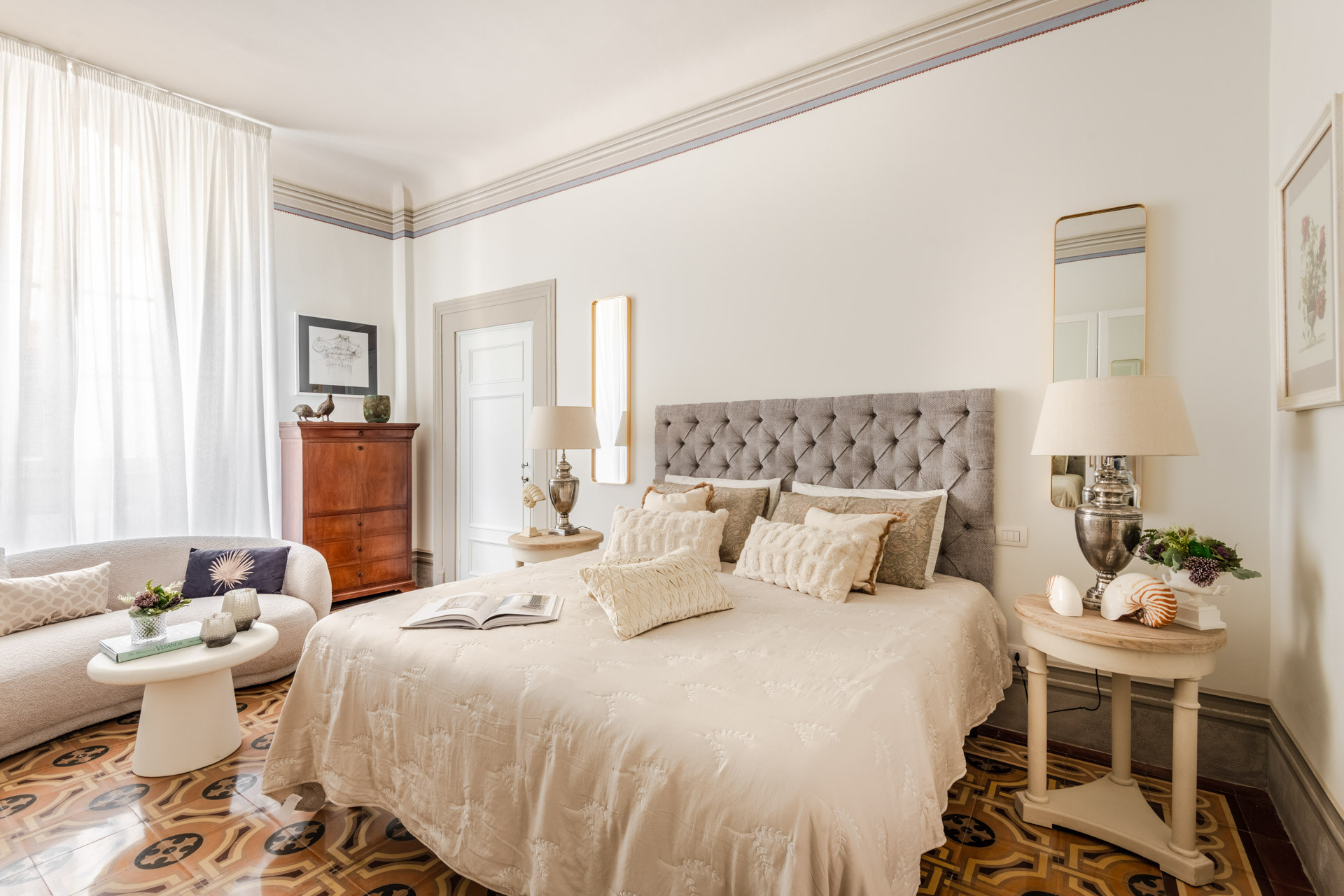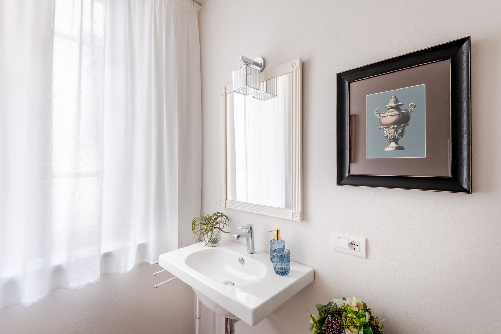 The apartment features three double bedrooms, each thoughtfully decorated with a touch of classic Italian elegance. One of the bedrooms boasts an exquisite frescoed ceiling, an authentic reminder of the home’s noble past.