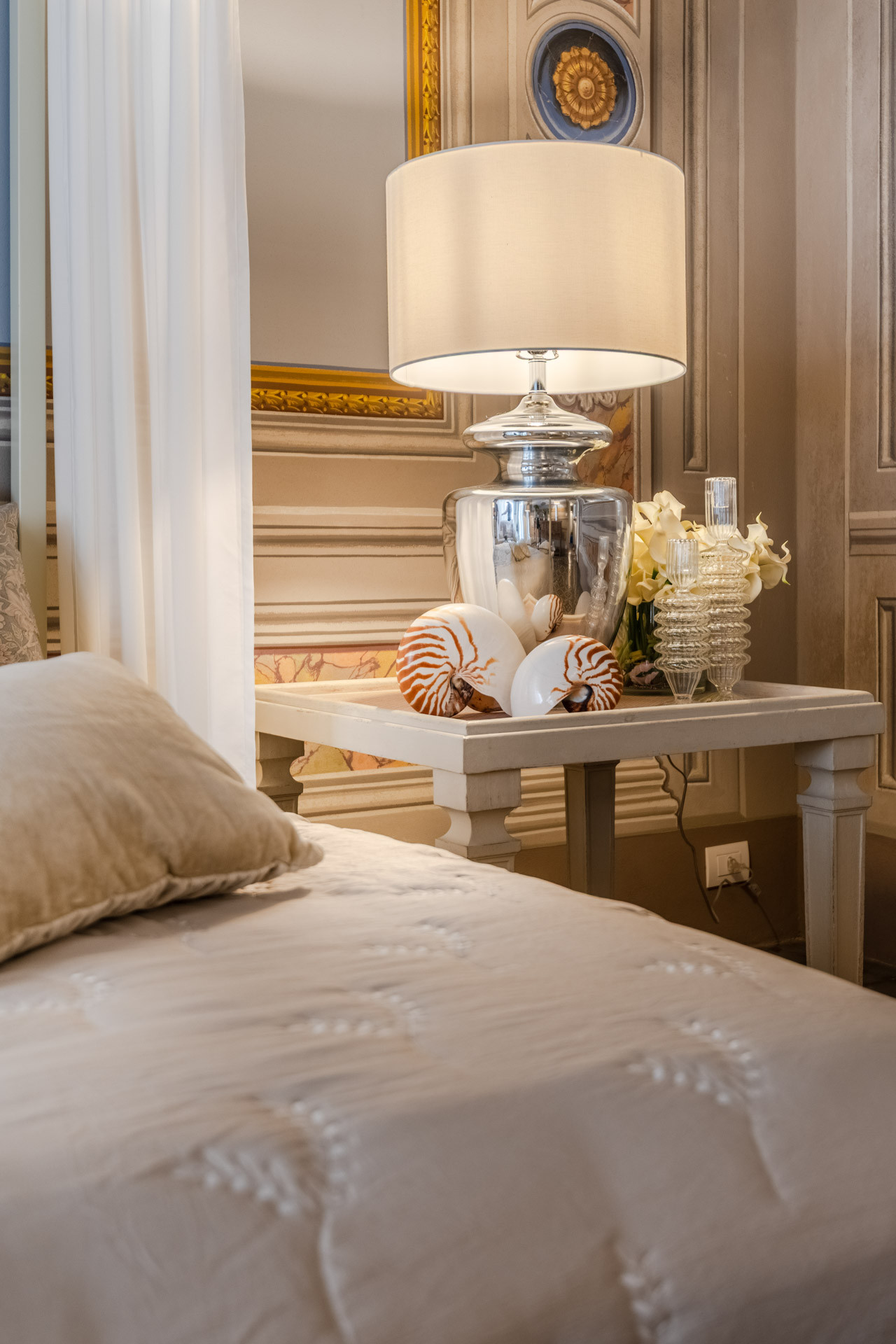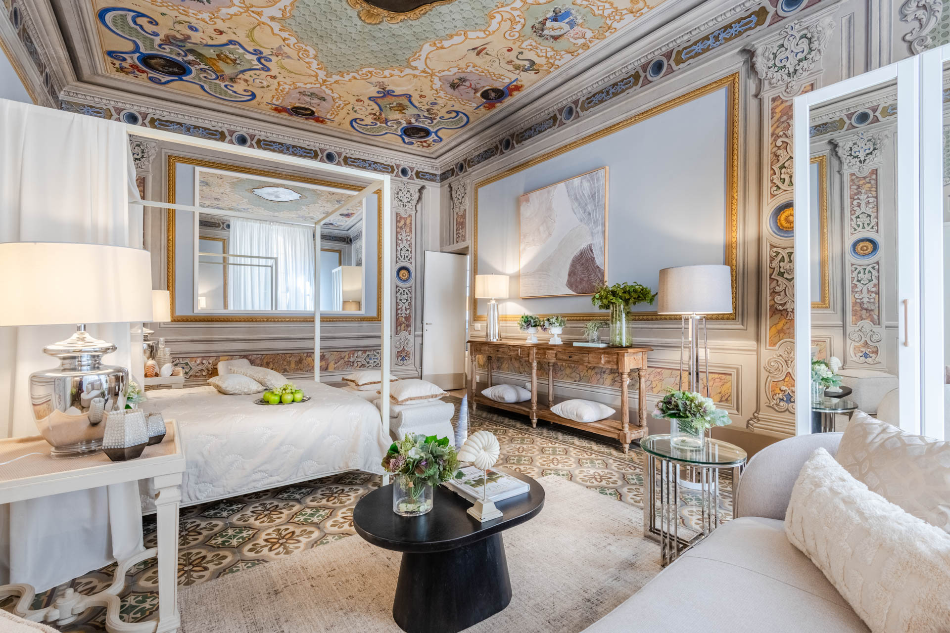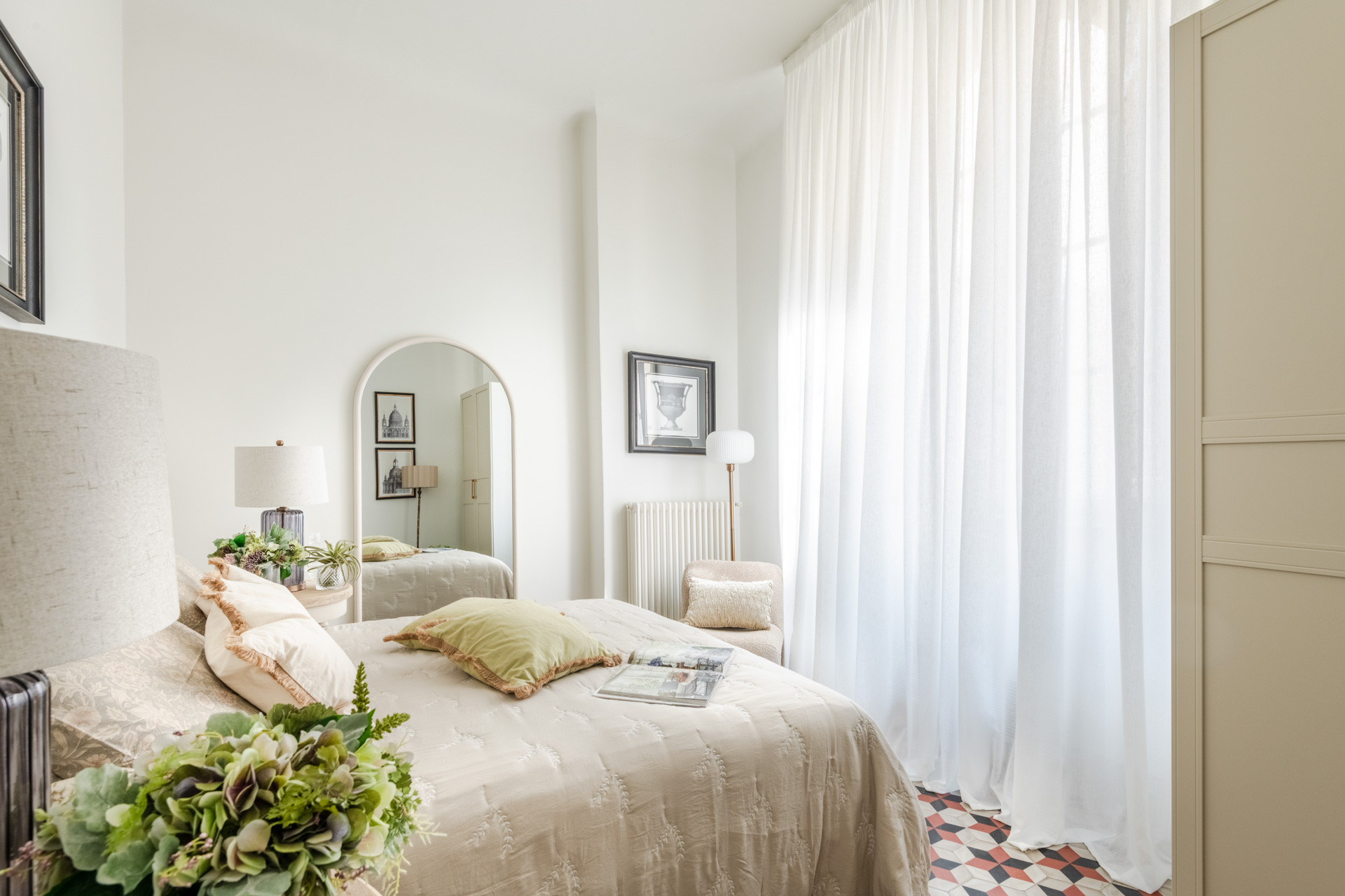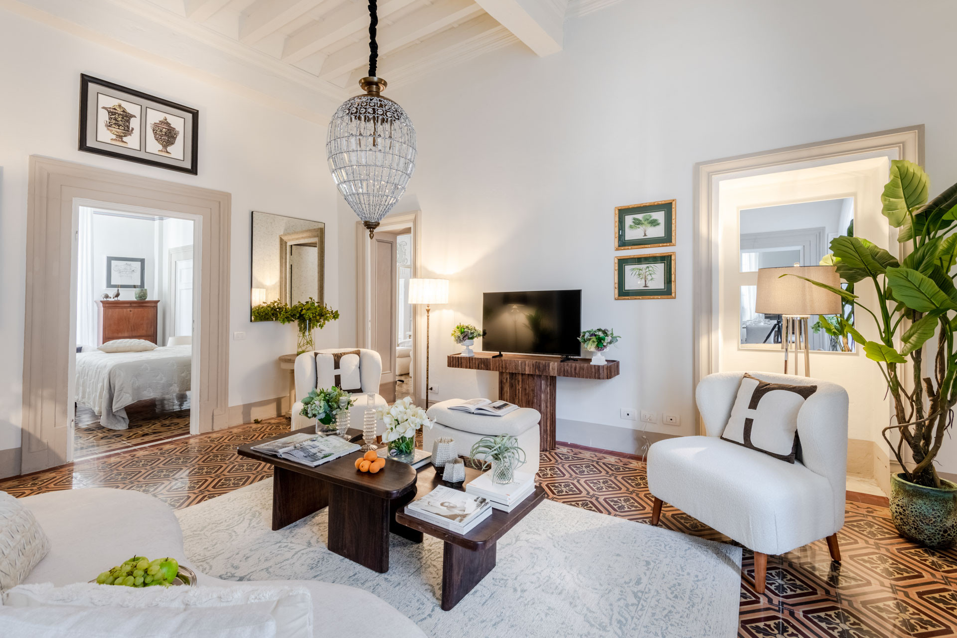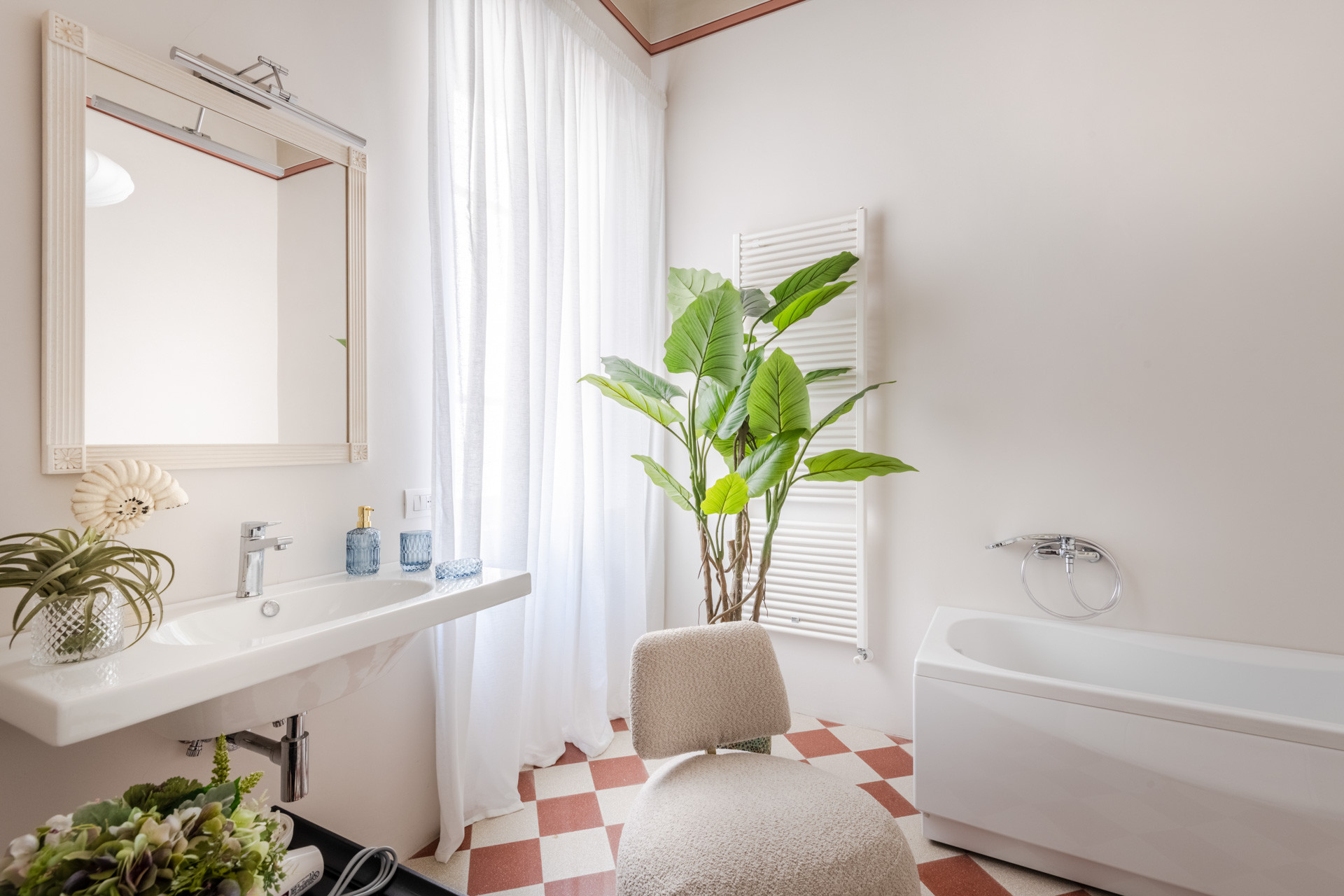 The apartment features three double bedrooms, each thoughtfully decorated with a touch of classic Italian elegance. One of the bedrooms boasts an exquisite frescoed ceiling, an authentic reminder of the home’s noble past.