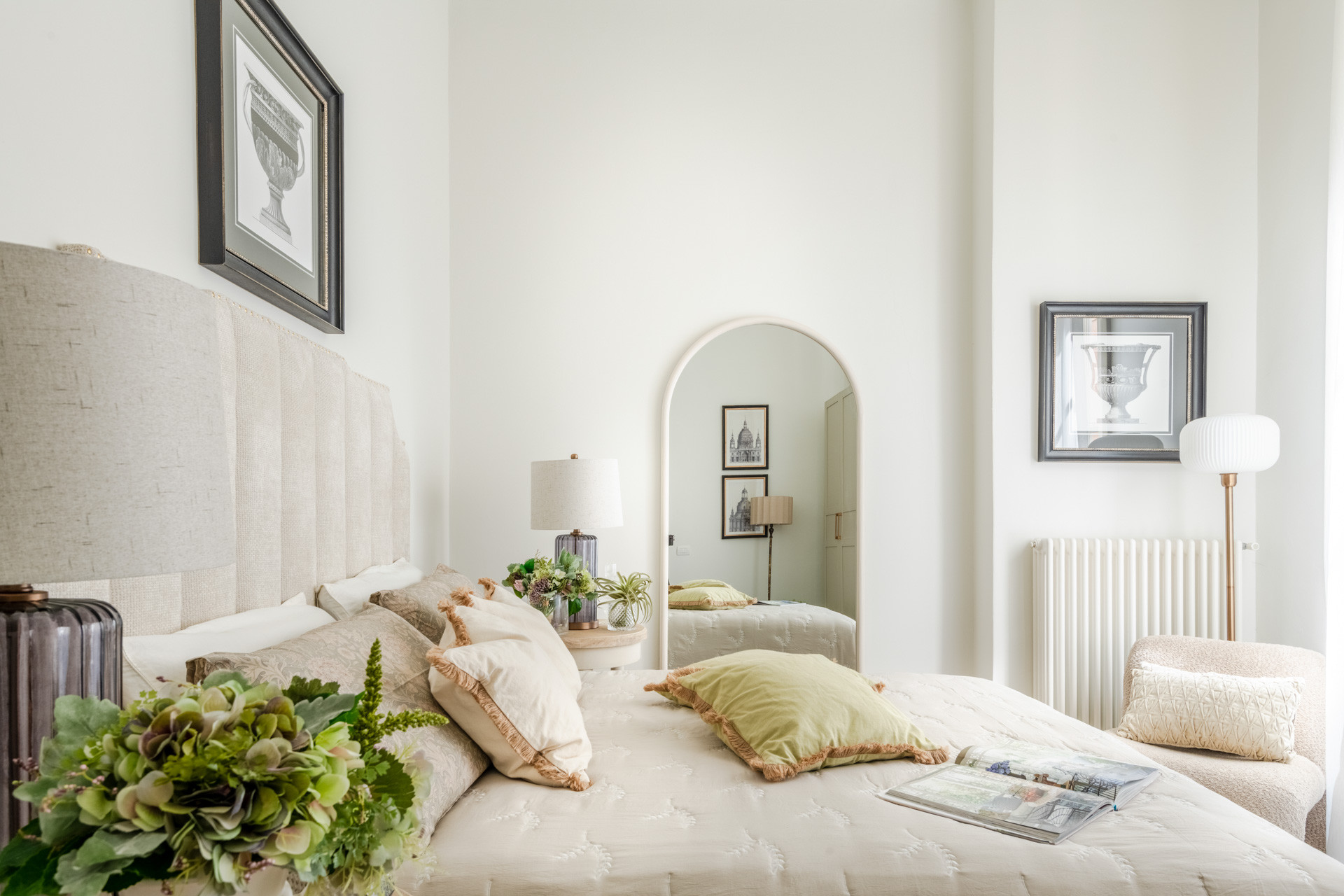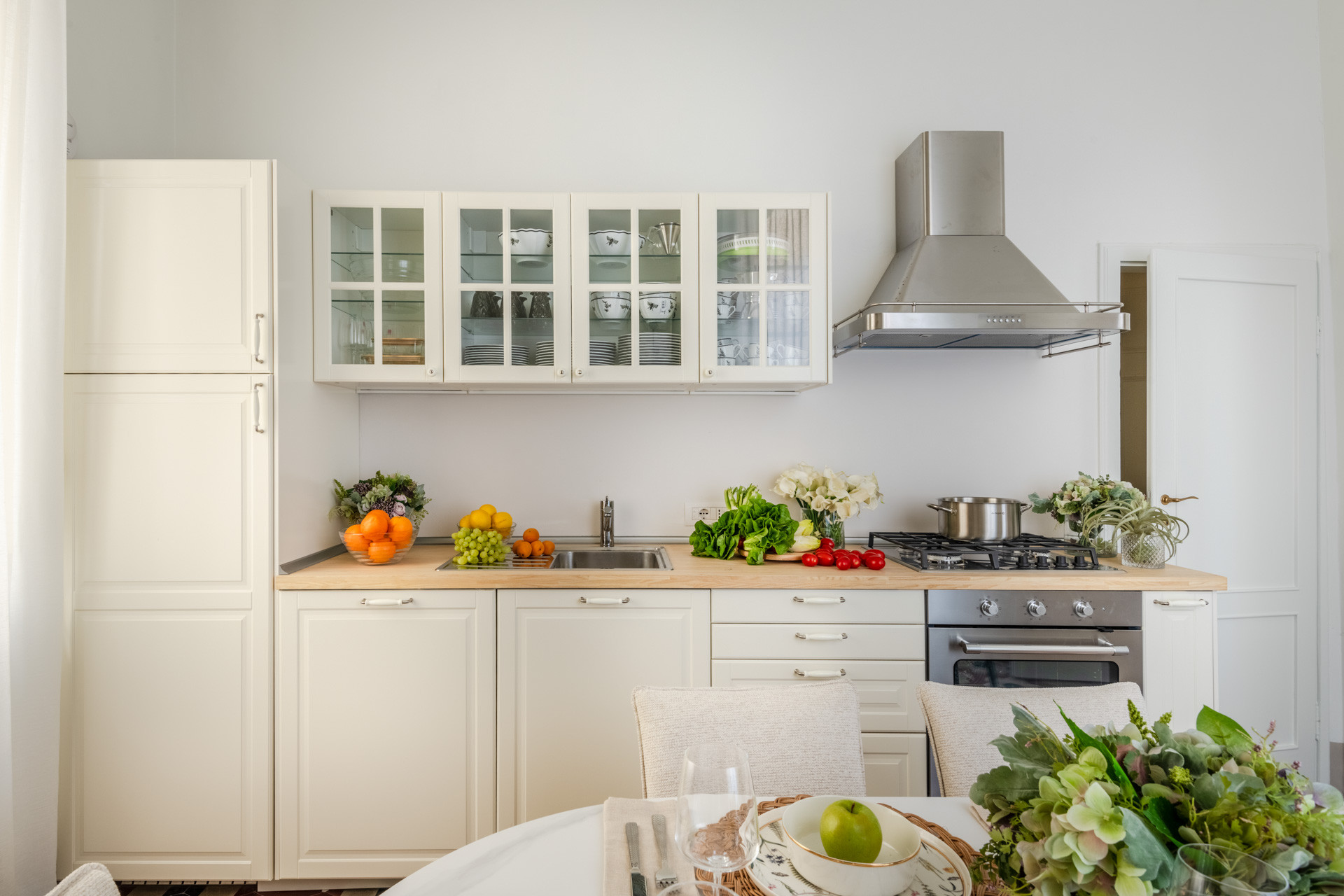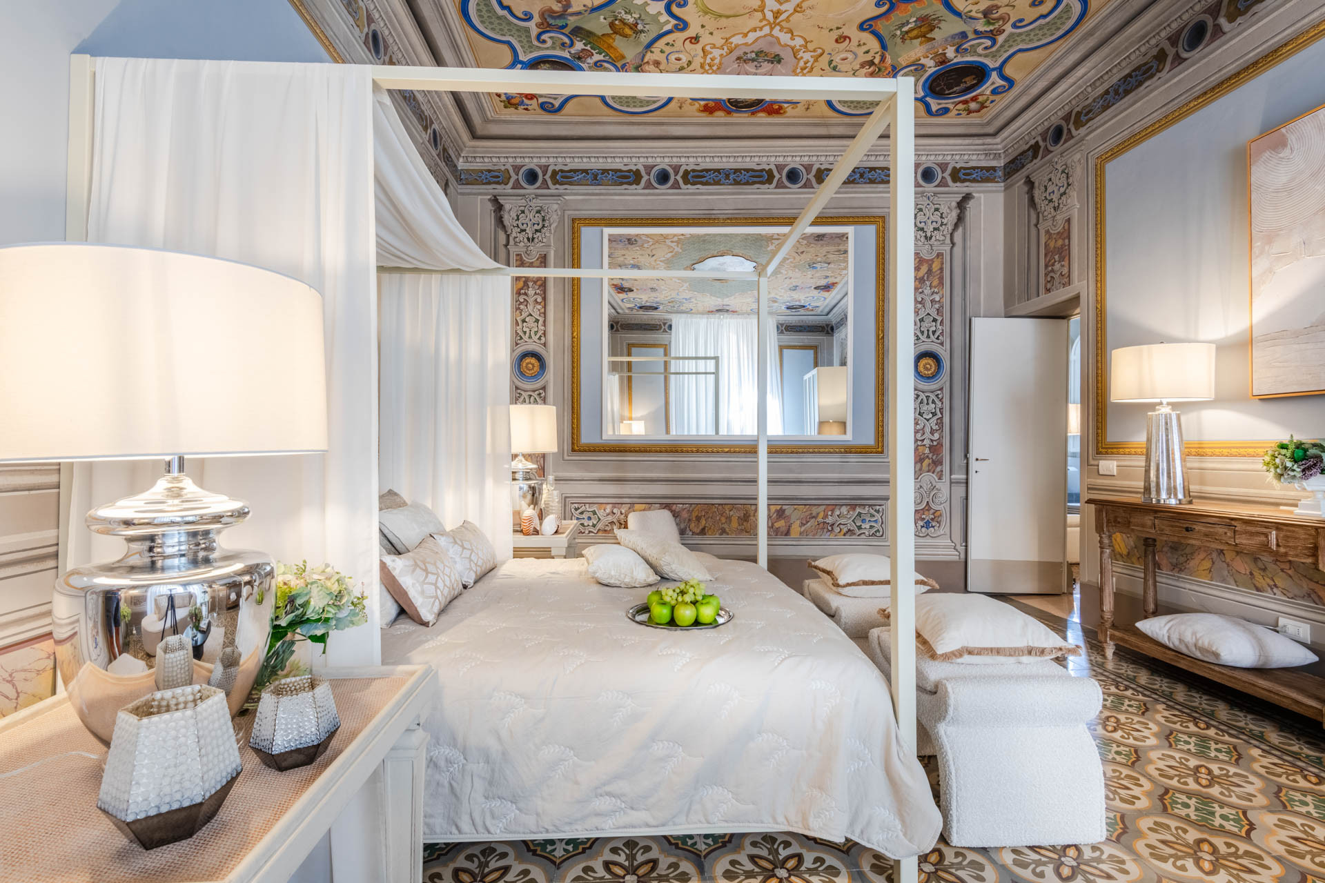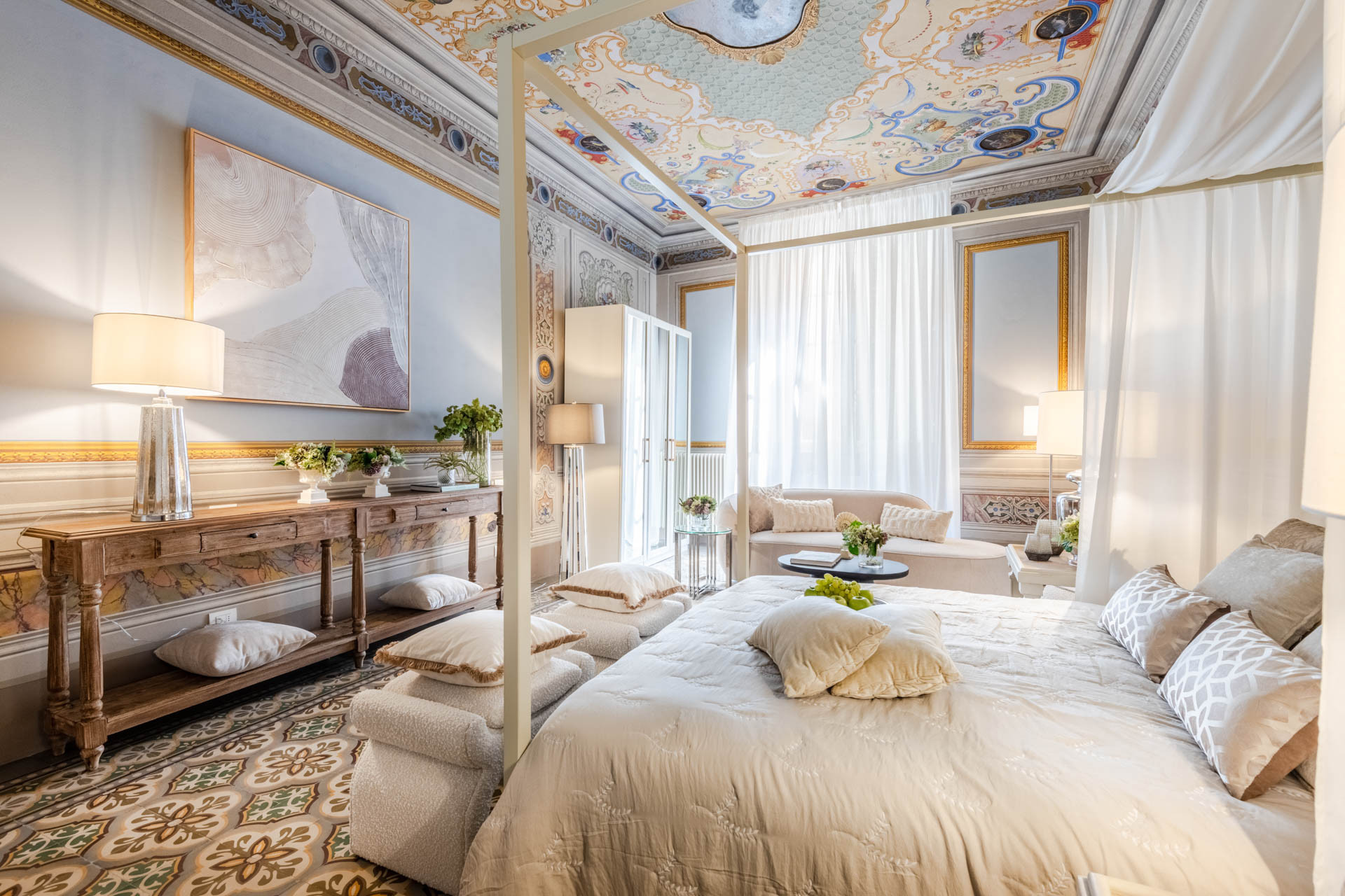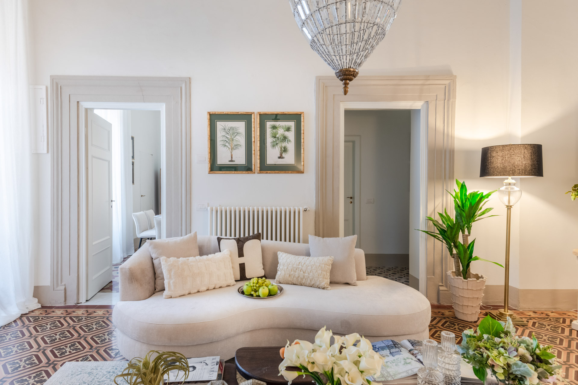 The apartment features three double bedrooms, each thoughtfully decorated with a touch of classic Italian elegance. One of the bedrooms boasts an exquisite frescoed ceiling, an authentic reminder of the home’s noble past.