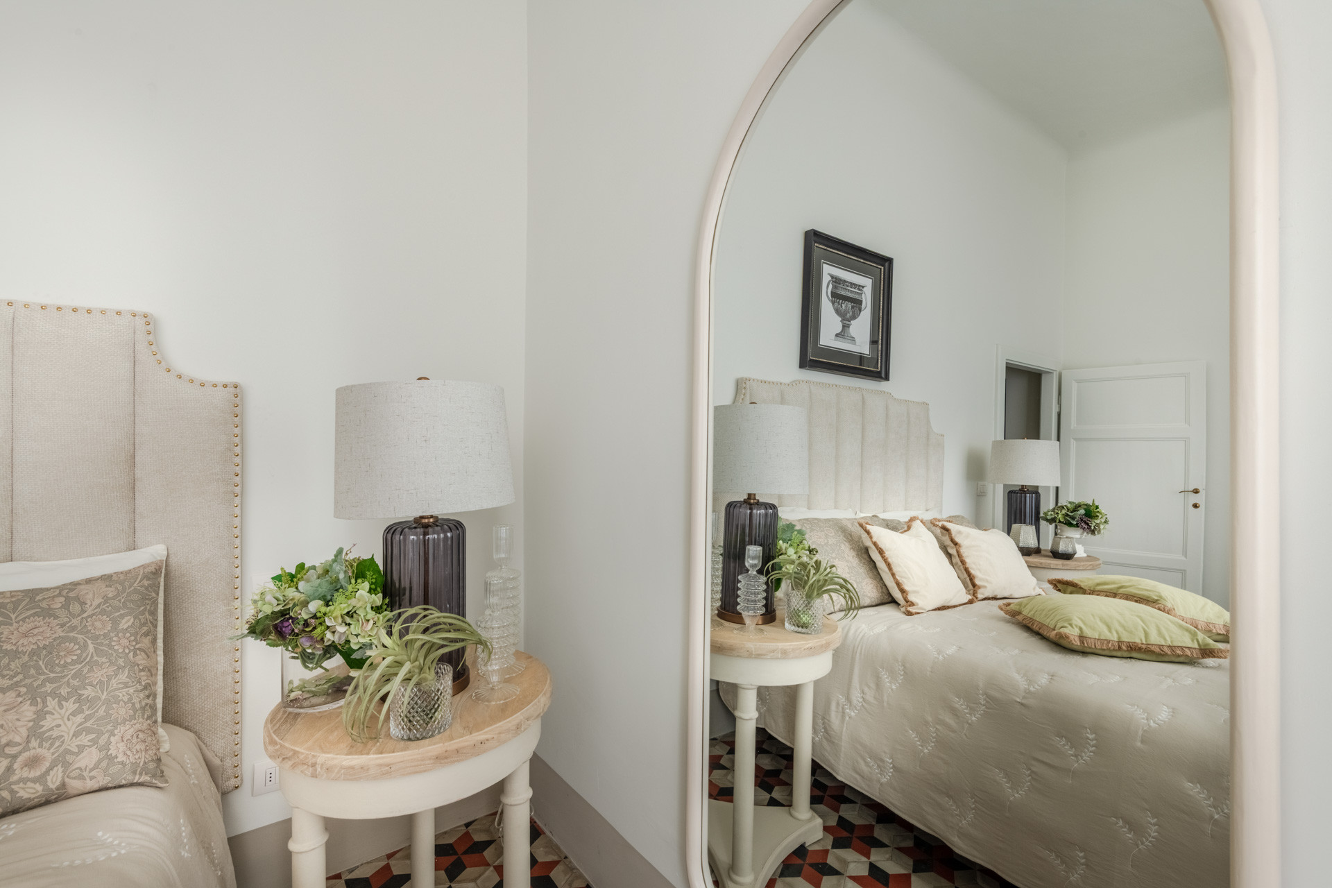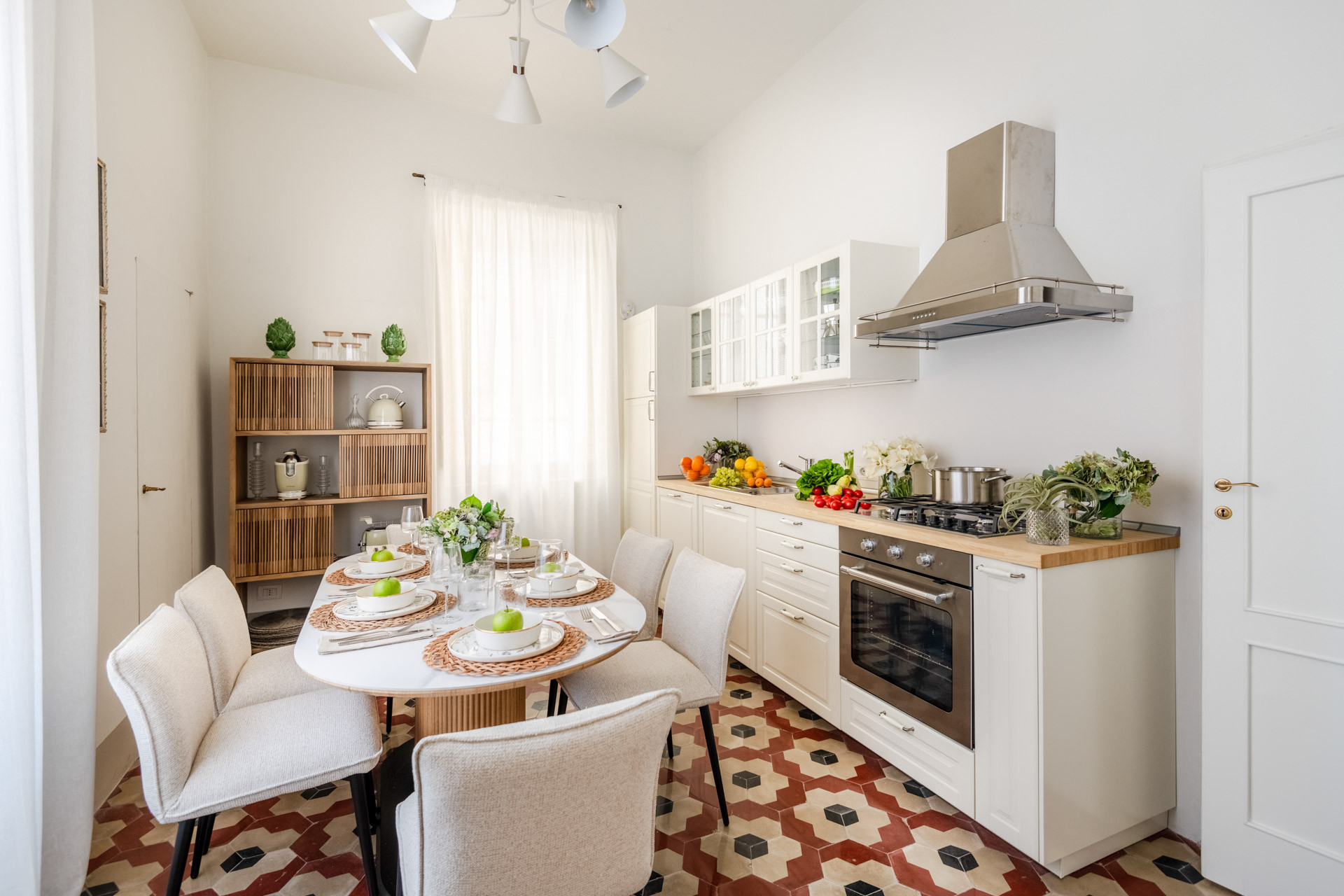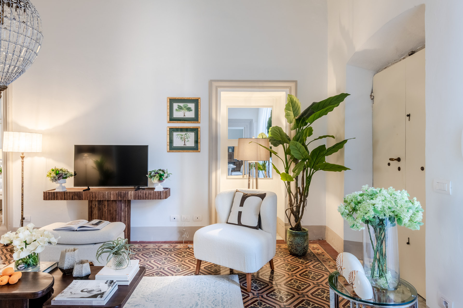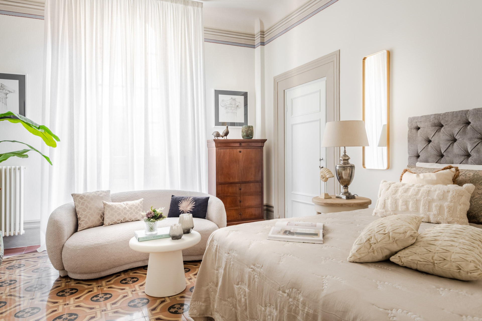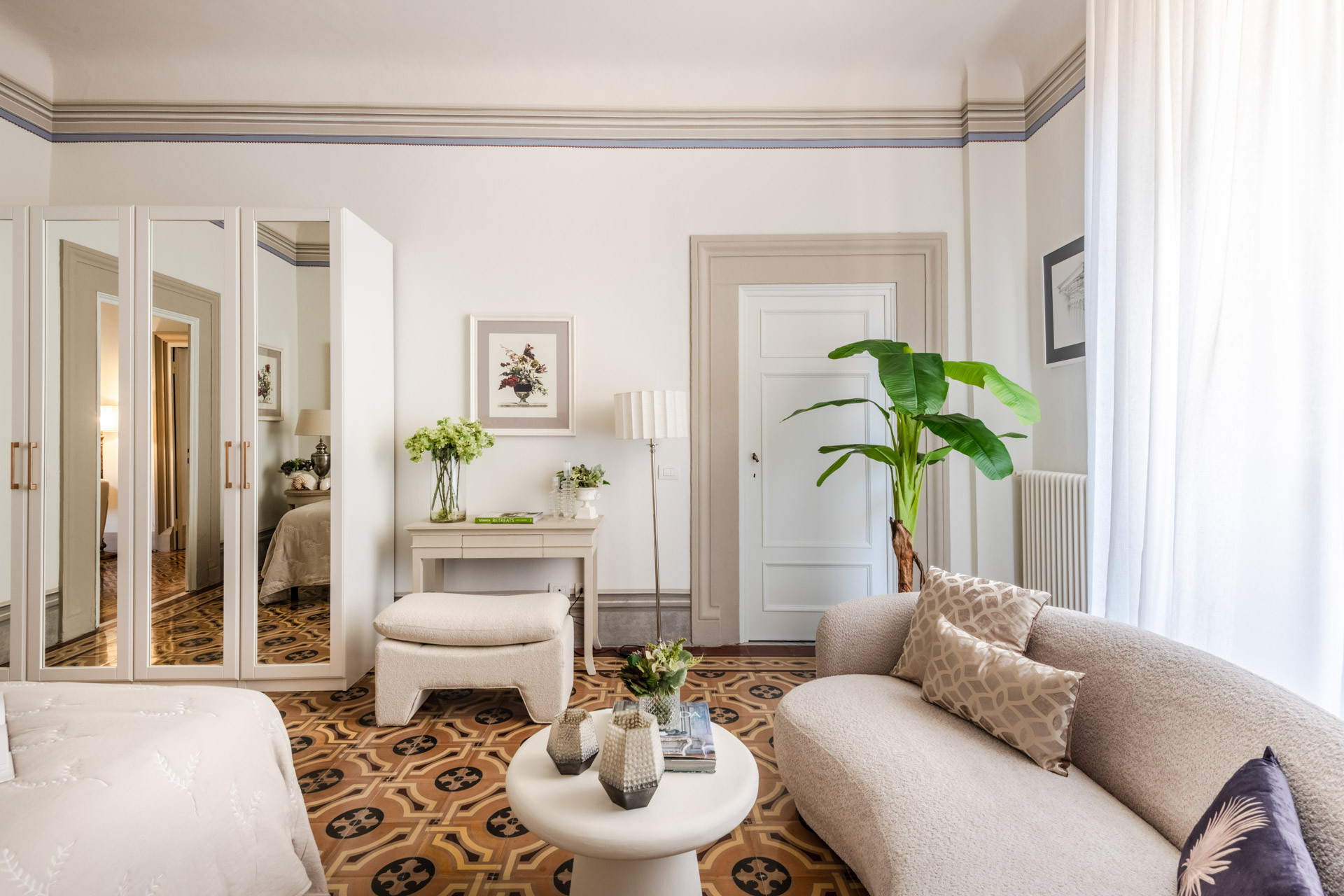 Every corner of The Frescoed Tale tells a story: the original tessieri floors, a hallmark of Lucca’s historic residences, add character and depth to the space, while carefully curated furnishings bring a sense of harmony and quiet sophistication. The apartment has been fully renovated, combining historical charm with modern amenities.