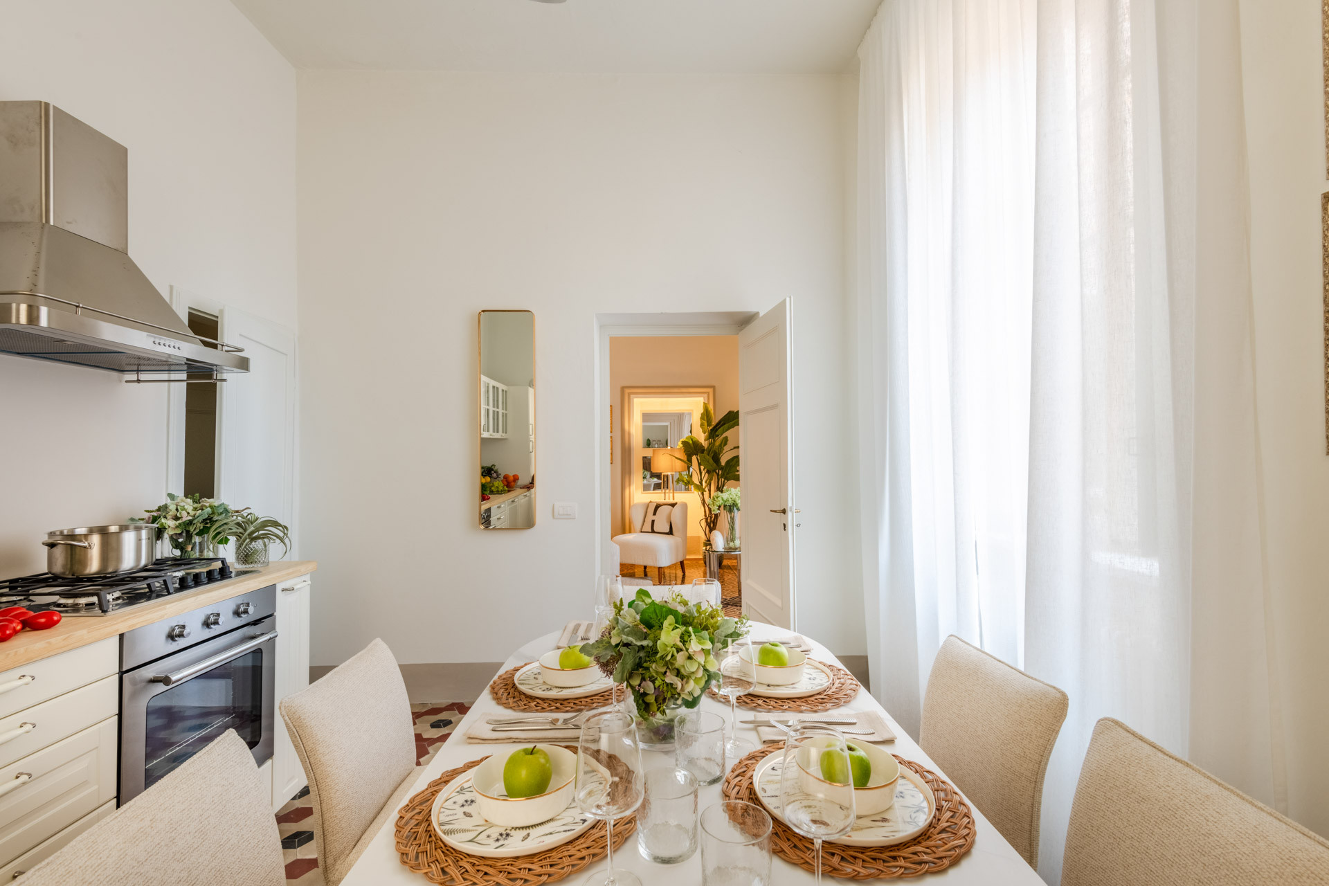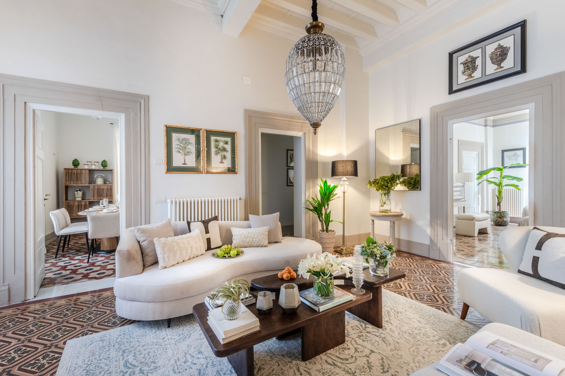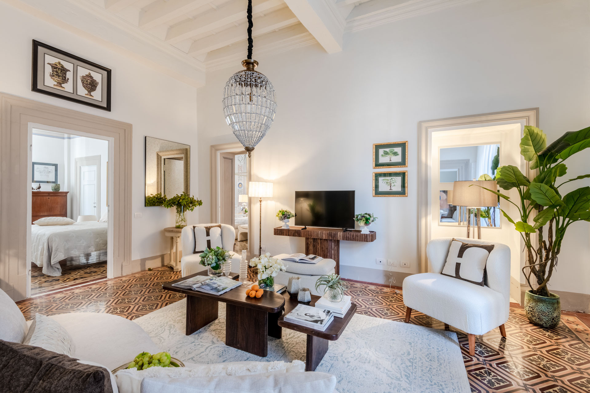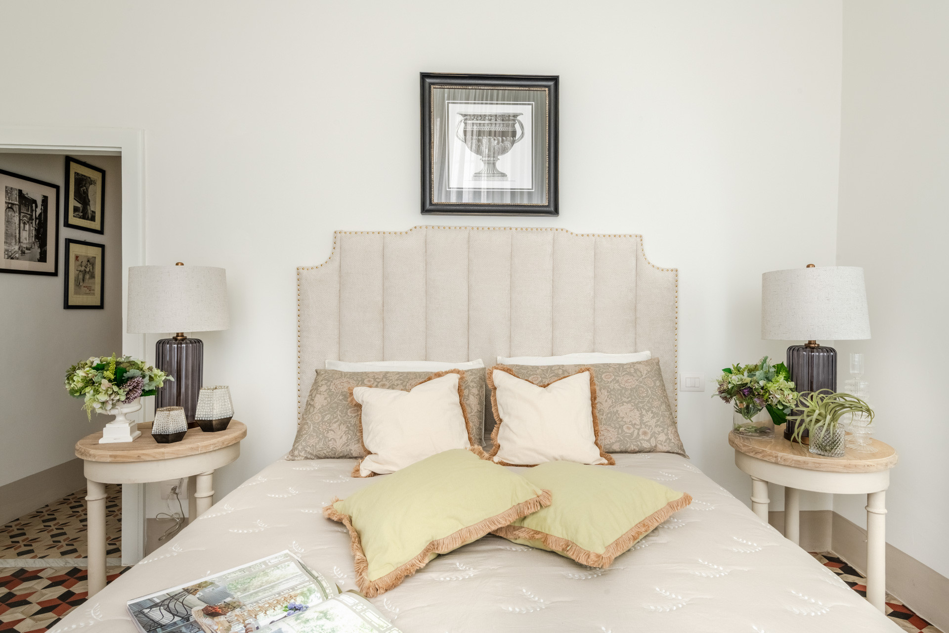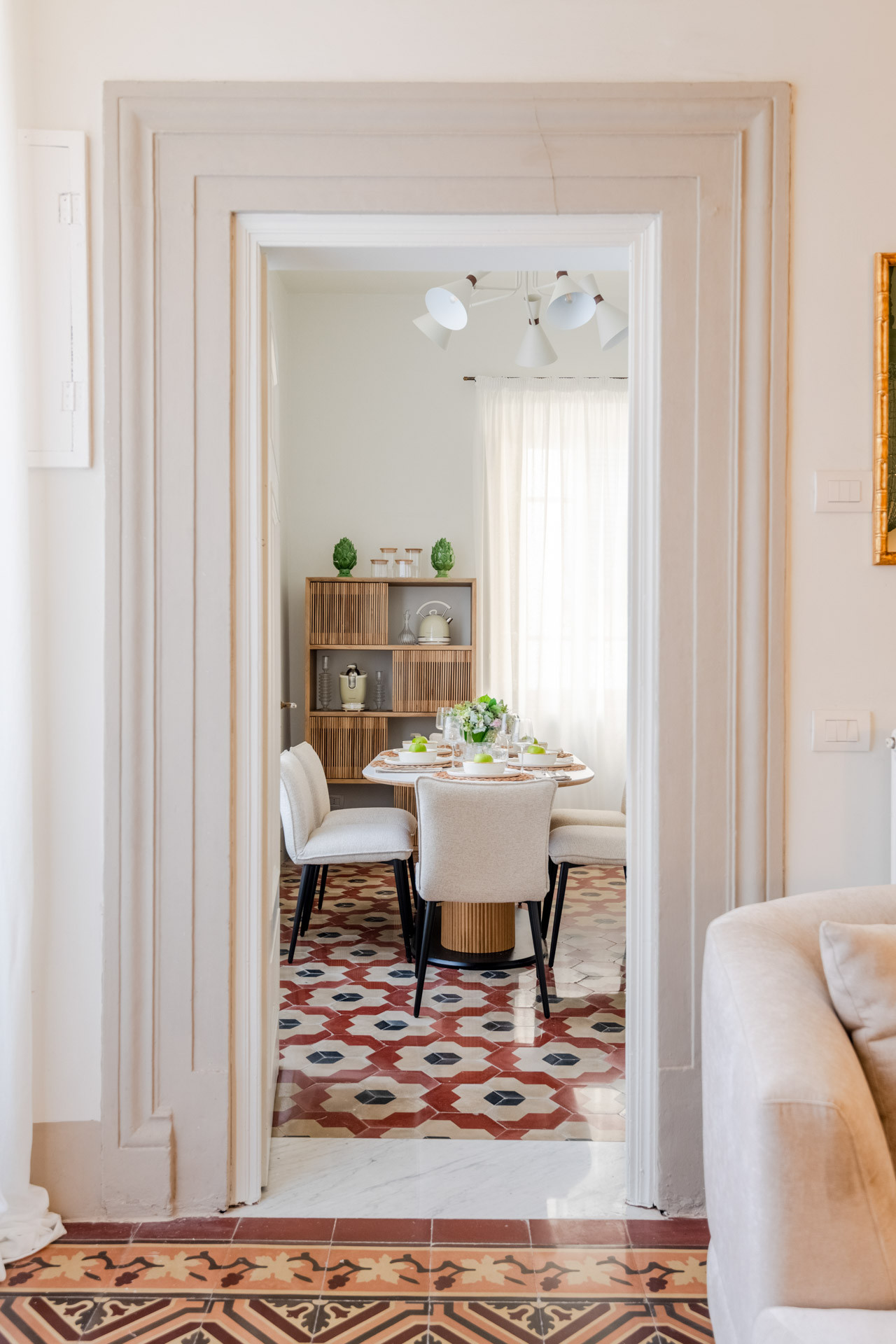 Every corner of The Frescoed Tale tells a story: the original tessieri floors, a hallmark of Lucca’s historic residences, add character and depth to the space, while carefully curated furnishings bring a sense of harmony and quiet sophistication. The apartment has been fully renovated, combining historical charm with modern amenities.