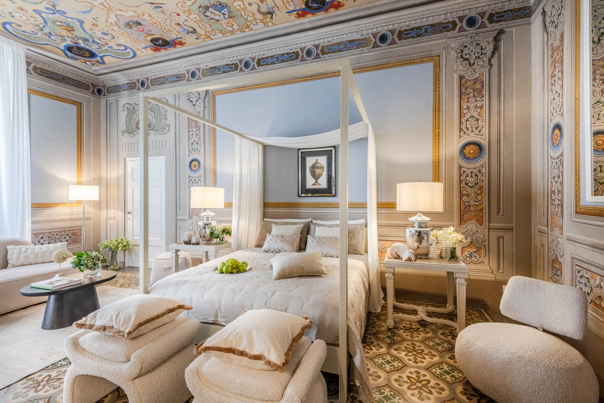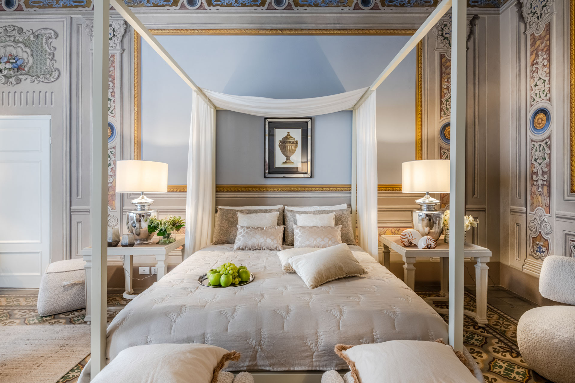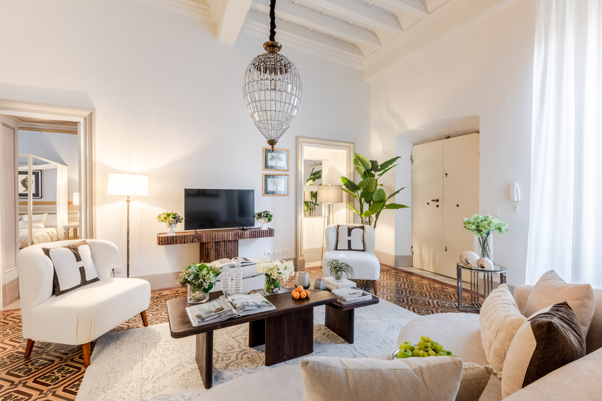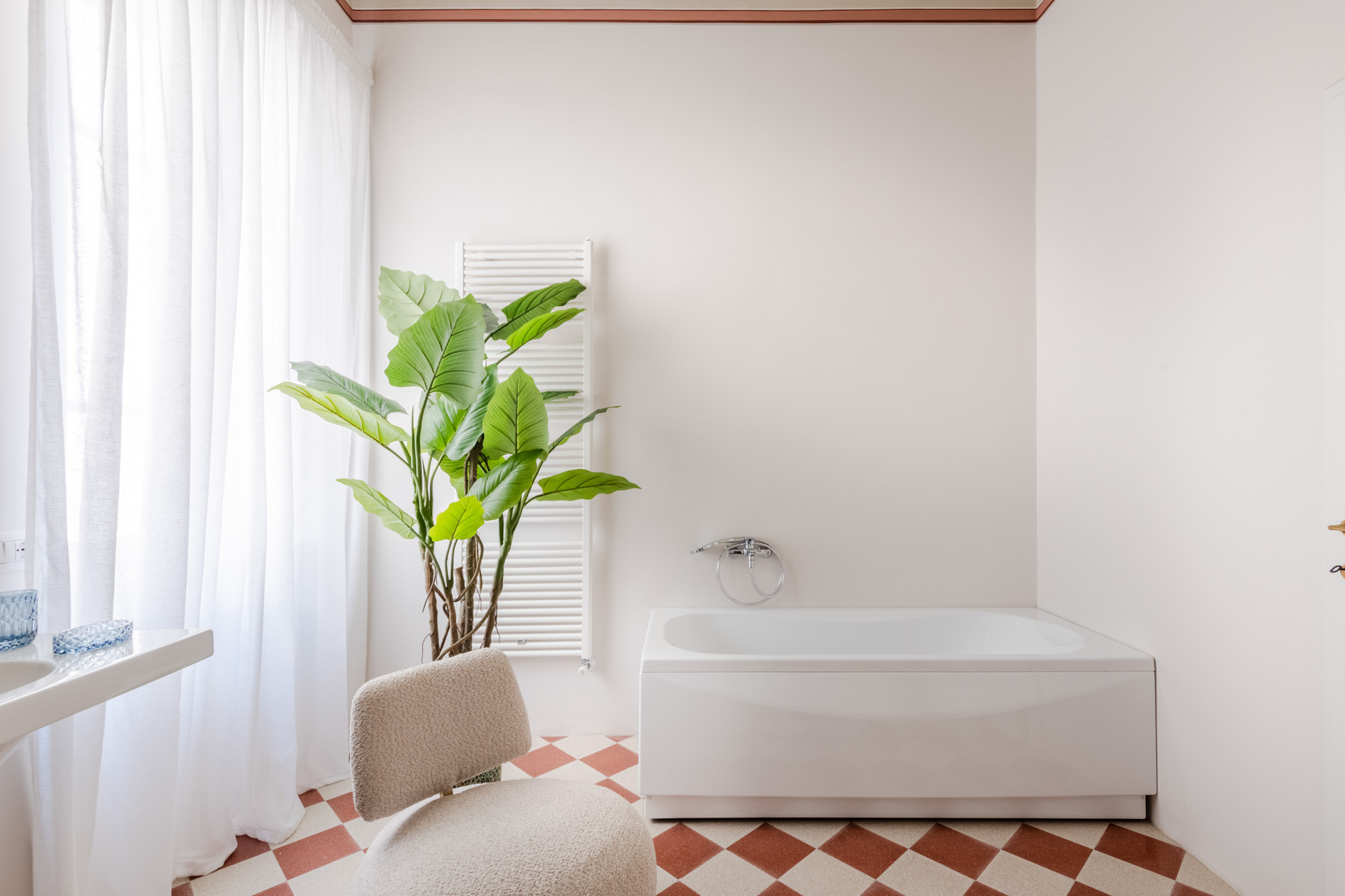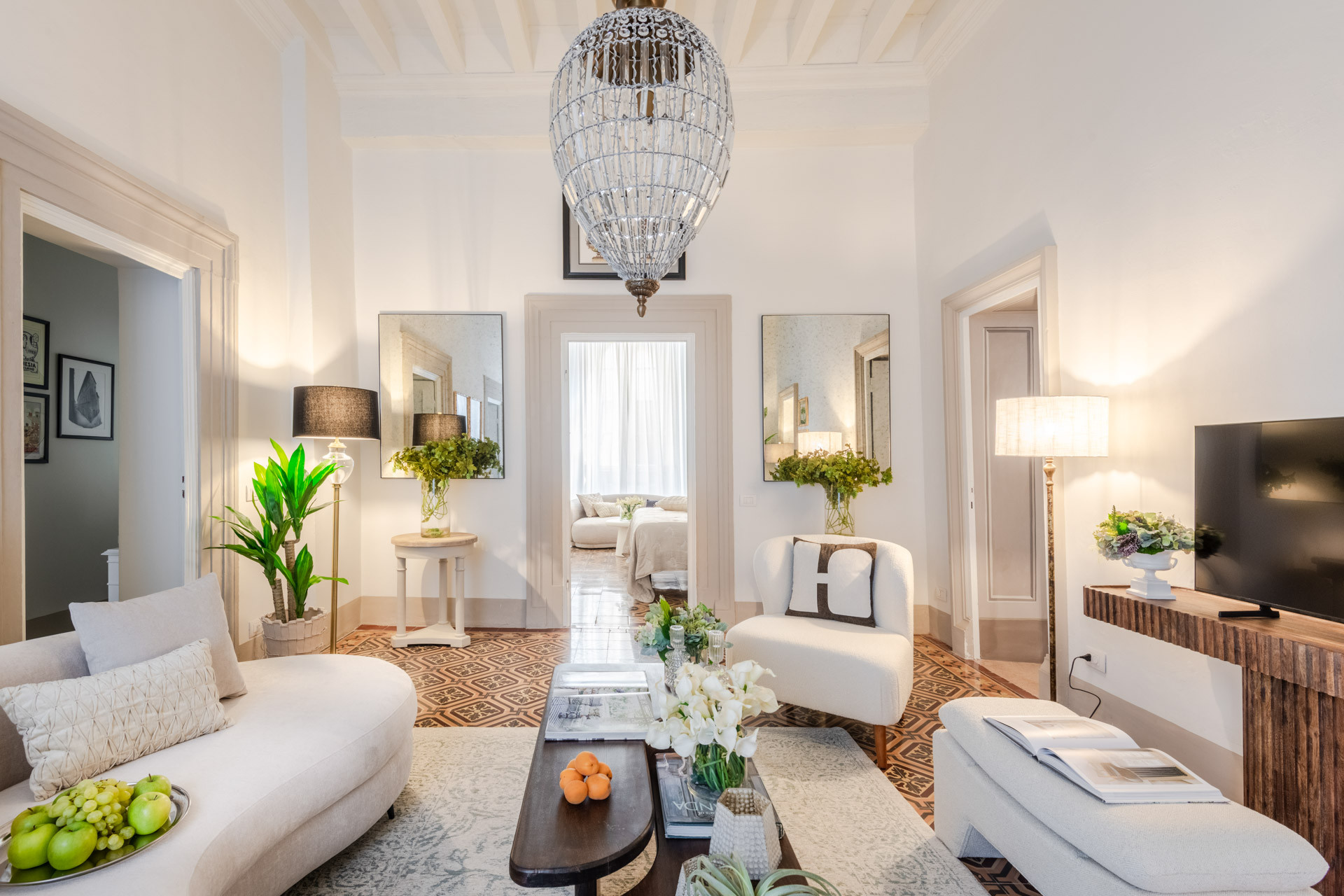 Every corner of The Frescoed Tale tells a story: the original tessieri floors, a hallmark of Lucca’s historic residences, add character and depth to the space, while carefully curated furnishings bring a sense of harmony and quiet sophistication. The apartment has been fully renovated, combining historical charm with modern amenities.