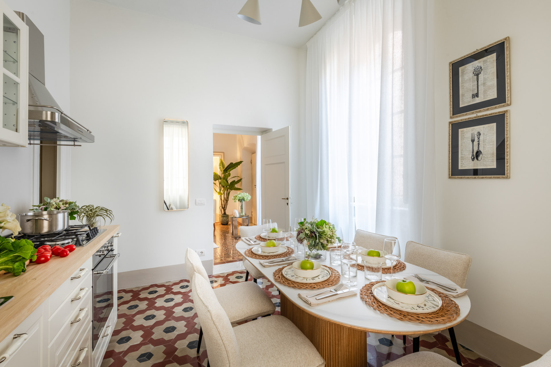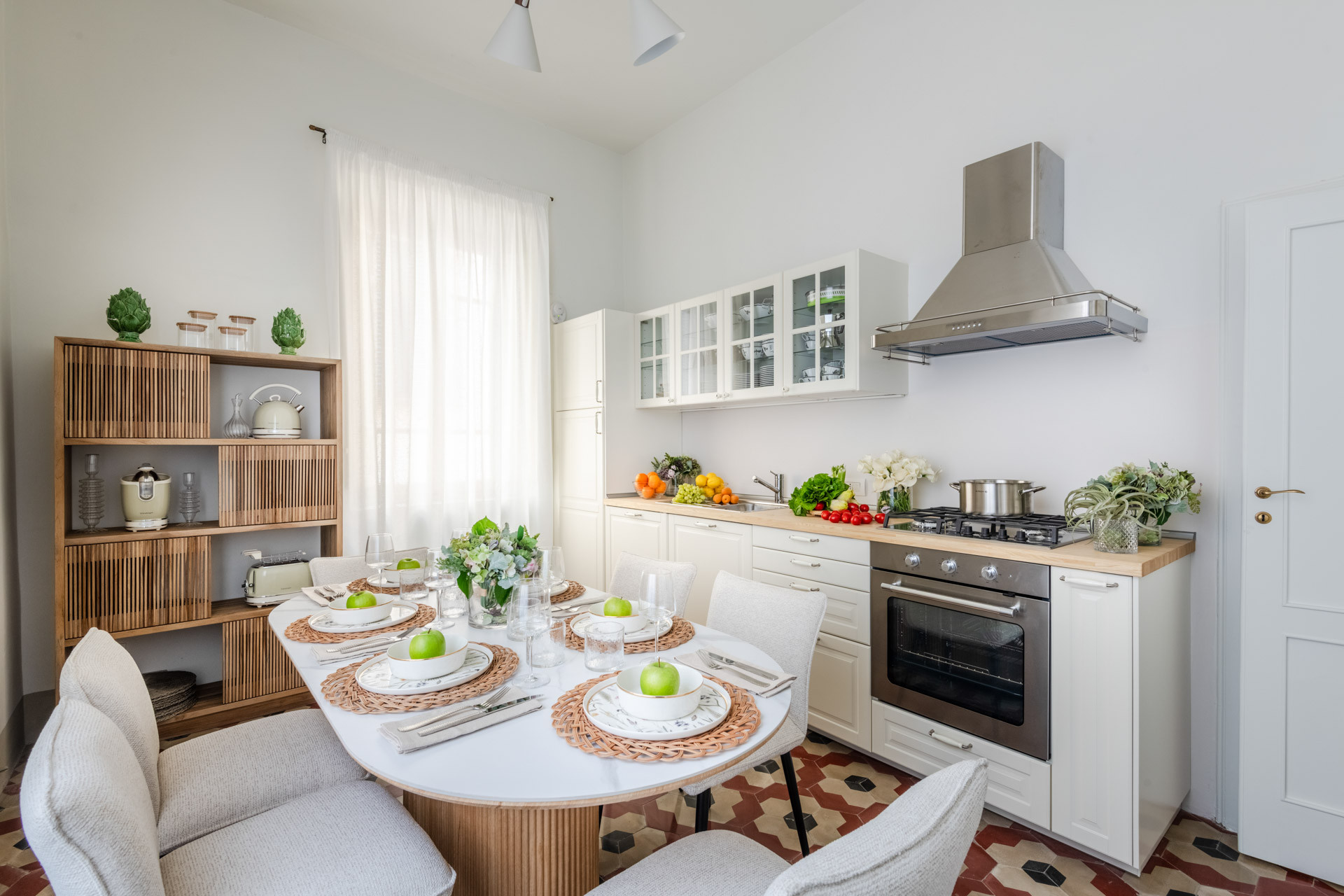 Upon entering, guests are welcomed into a spacious and luminous living room — a refined setting where soft neutral tones, elegant textures, and original architectural details create a warm and serene atmosphere. The adjoining dining kitchen is fully equipped and designed for convivial meals, bathed in natural light streaming through large windows.