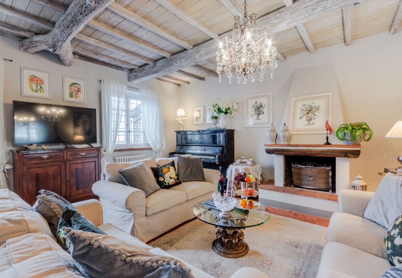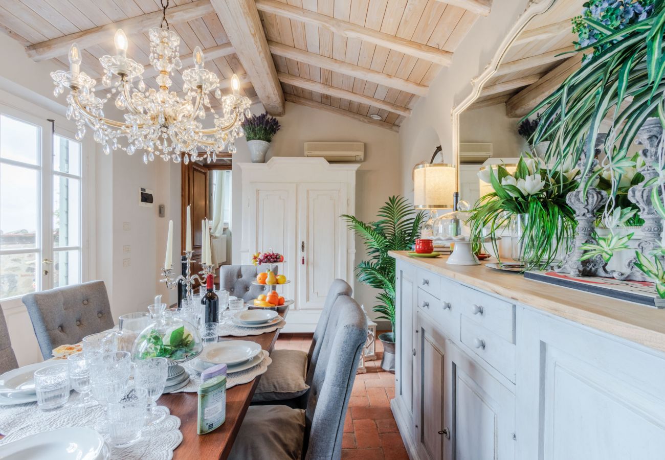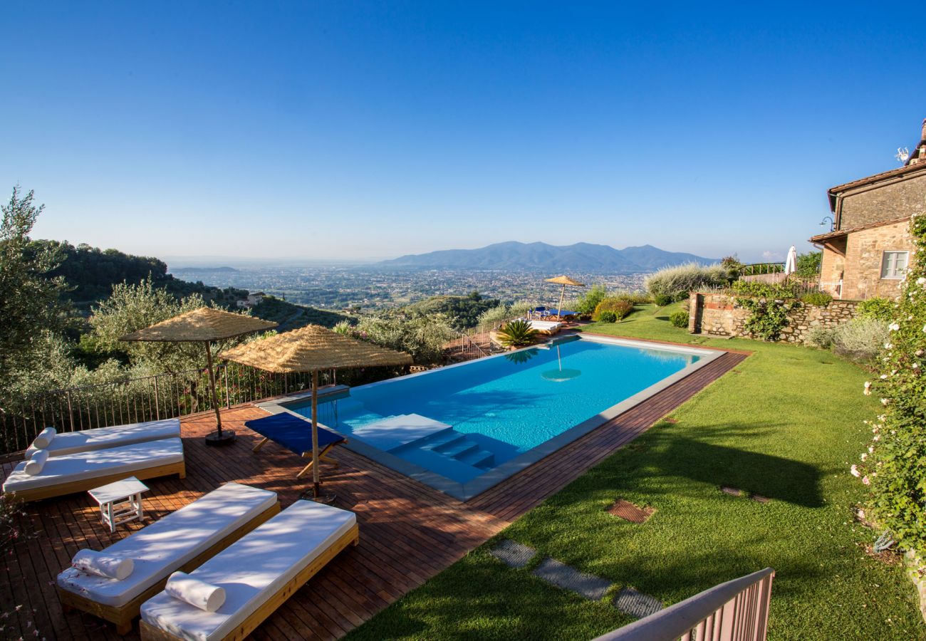 LA MACINA FARMHOUSE AND OLIVE OIL ESTATE is located on the hills of Lucca in the village of CICIANA among among a 5 ha private estate where EXTRA VIRGIN OLIVE OIL is produced by the owners. The rental property is made up of 3 stone houses which are all located around the pool and that are rented entirely to only 1 party per time, so privacy is never compromised. This is an area of Tuscany that opens up endless exploring possibilities: medieval hilltop towns, some of Europe's most renowned vineyards and some of its most alluring sights and cities. Pisa, Florence and Siena are all under an hour away and within 10 to 15 minutes you can be in Lucca city centre inside the walls. A week of serious exploring combined with easy relaxation strikes an excellent balance. La Macina Farmhouse invites outdoor living: you are fabulously well set up with a poolside terrace for drinks and unforgettable evenings with your friends while enjoying the view of the town at your feet, or for creating a wonderful atmosphere in the evenings, sunset on cue and maybe some bruschetta and a glass of Chianti in hand. By the side of the main house there s a fabulous shady area with big reclining wooden chairs and an outdoor fully equipped kitchen with a big refrigerator, electric oven, stoves, dishwasher and BBQ + wood fired pizza oven. Around the front it s set up for al fresco dining with a stone table and chairs to sit 12 that call for long dinners and plenty of chatter deep into the balmy evenings. The INFINITY POOL with hydromassage Jacuzzi area (pool size it is 12 metres x 6.5 metres) is magnificent and has an amazing deck with 8 sunbeds and a view over the valley. Next to the pool there is a bathroom. The pool system uses no chlorine but salt, so the water is healthy and perfect for children or those who are allergic. Quality beach towels are provided for each guest. The interiors are very well equipped and full of charm and despite its farmhouse appeal it comes with the right appliances and facilities to make any cook at home. There are dishwashers, good quality espresso machines, kettles, toasters, overns and microwaves. Each of the three houses has a kitchen and dining room for cosy meals and double doors open conveniently onto the front terrace and pergola area where guests can enjoy a glass of wine or dine watching the sun go down and each of the three houses has a living room for private relaxation.