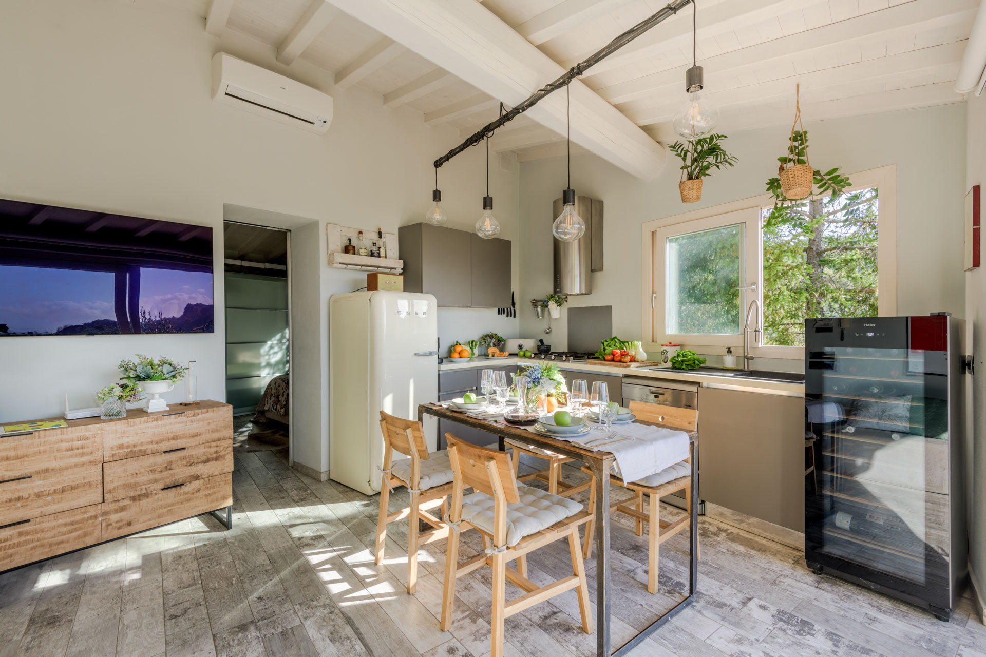 Ground floor: it features a fully equipped kitchen, a dining room that opens to the terrace/outdoor dining area, a cosy living room, a bathroom with a shower.