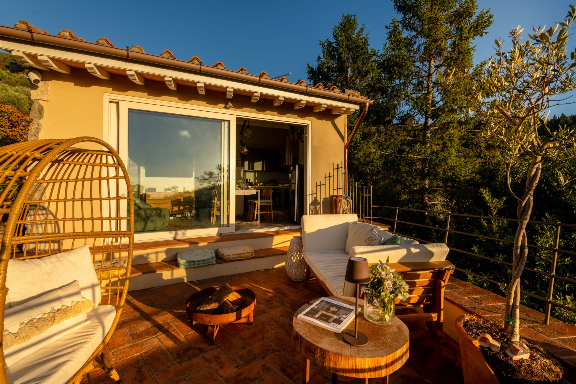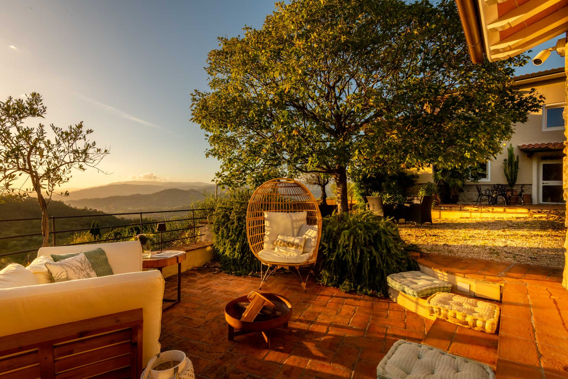 Outside, you can relax in the outdoor lounge with a brazier, enjoying the view of the hills. There is also a covered terrace with a dining table that offers a wonderful view, and a pool with sun loungers for your comfort.