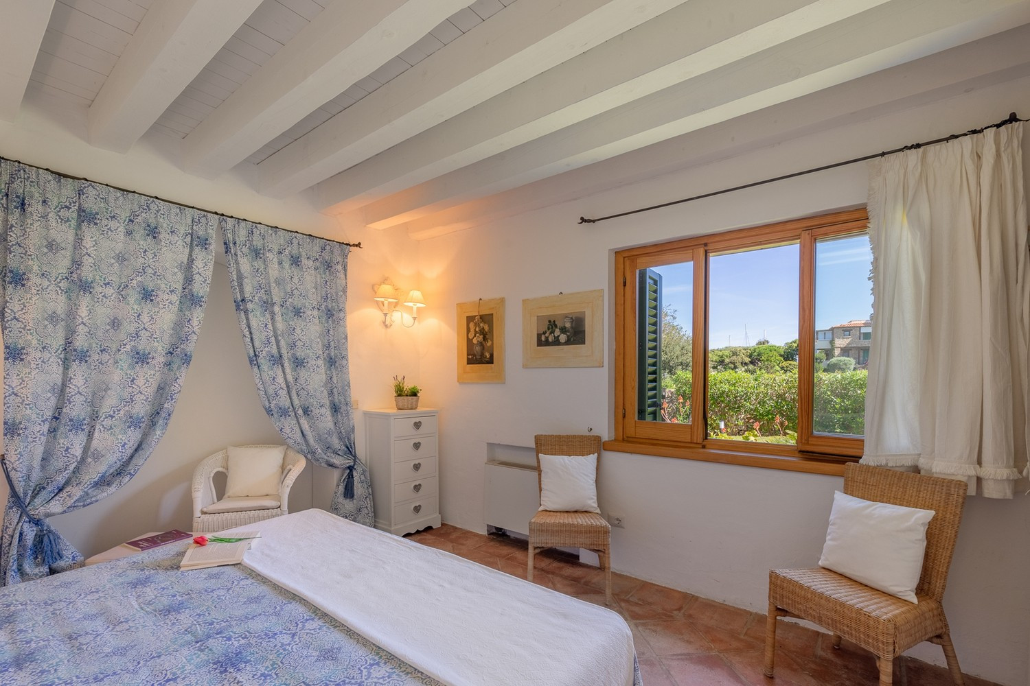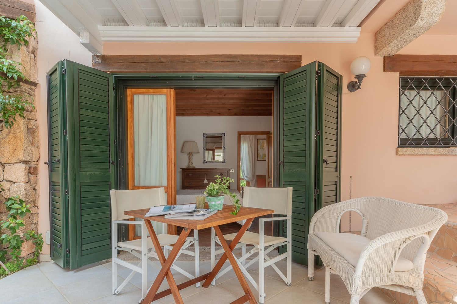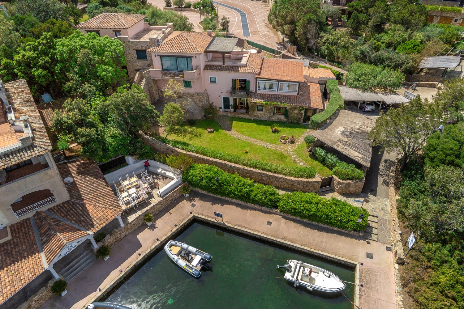 The villa is surrounded by a well-kept Mediterranean garden with lawn and native plants. The private swimming pool, rectangular with rounded corners, features a sunbathing area with loungers and an outdoor shower. The covered veranda on the first floor, furnished with a dining table and lounge area, offers panoramic sea views over Porto Rotondo’s marina. On the ground floor, a patio with outdoor dining area and barbecue is perfect for al fresco dinners.