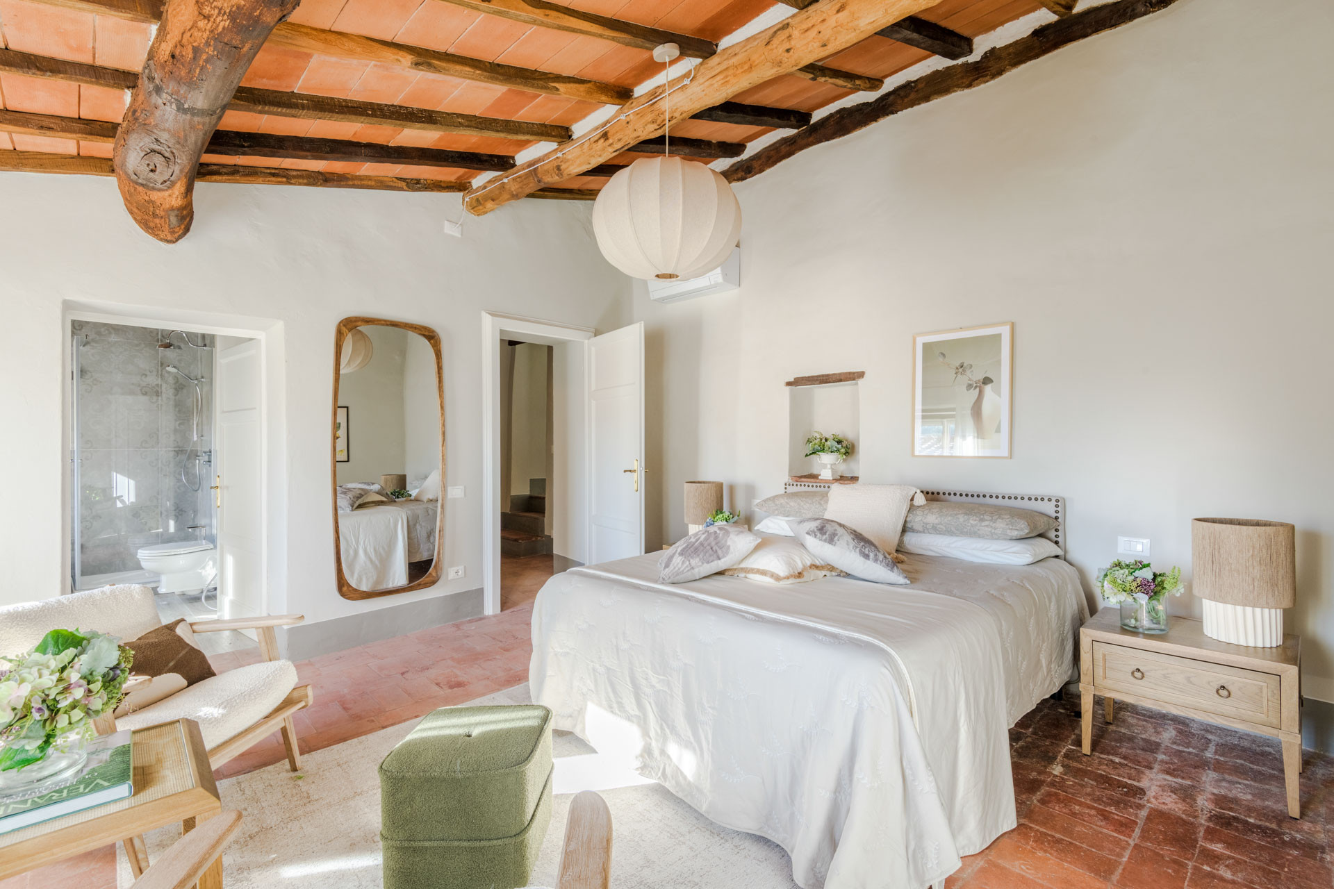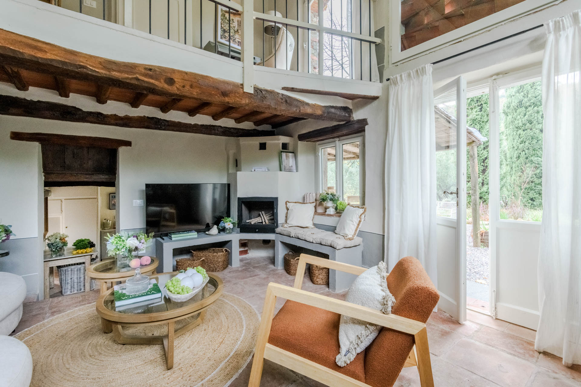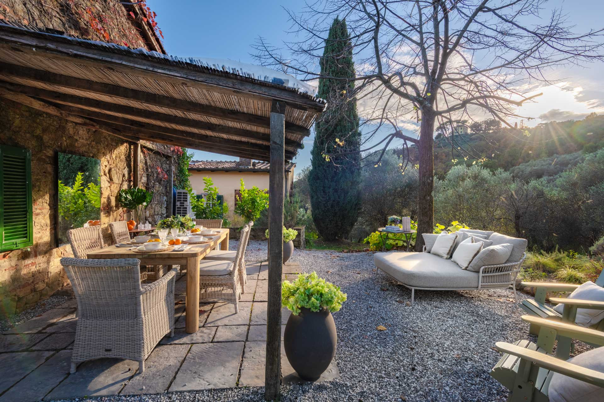 The cottage is nestled within a tiny, authentic hamlet where real Tuscan life still unfolds. Here, you’ll witness olive harvests by hand, old women tending their vegetable gardens with quiet devotion, and a wise old man strolling the lanes with his loyal dog, always wandering and looking for a gentle cuddle from the inhabitants of the hamlet. Life moves at a human pace, guided by tradition, seasons, and simple pleasures.