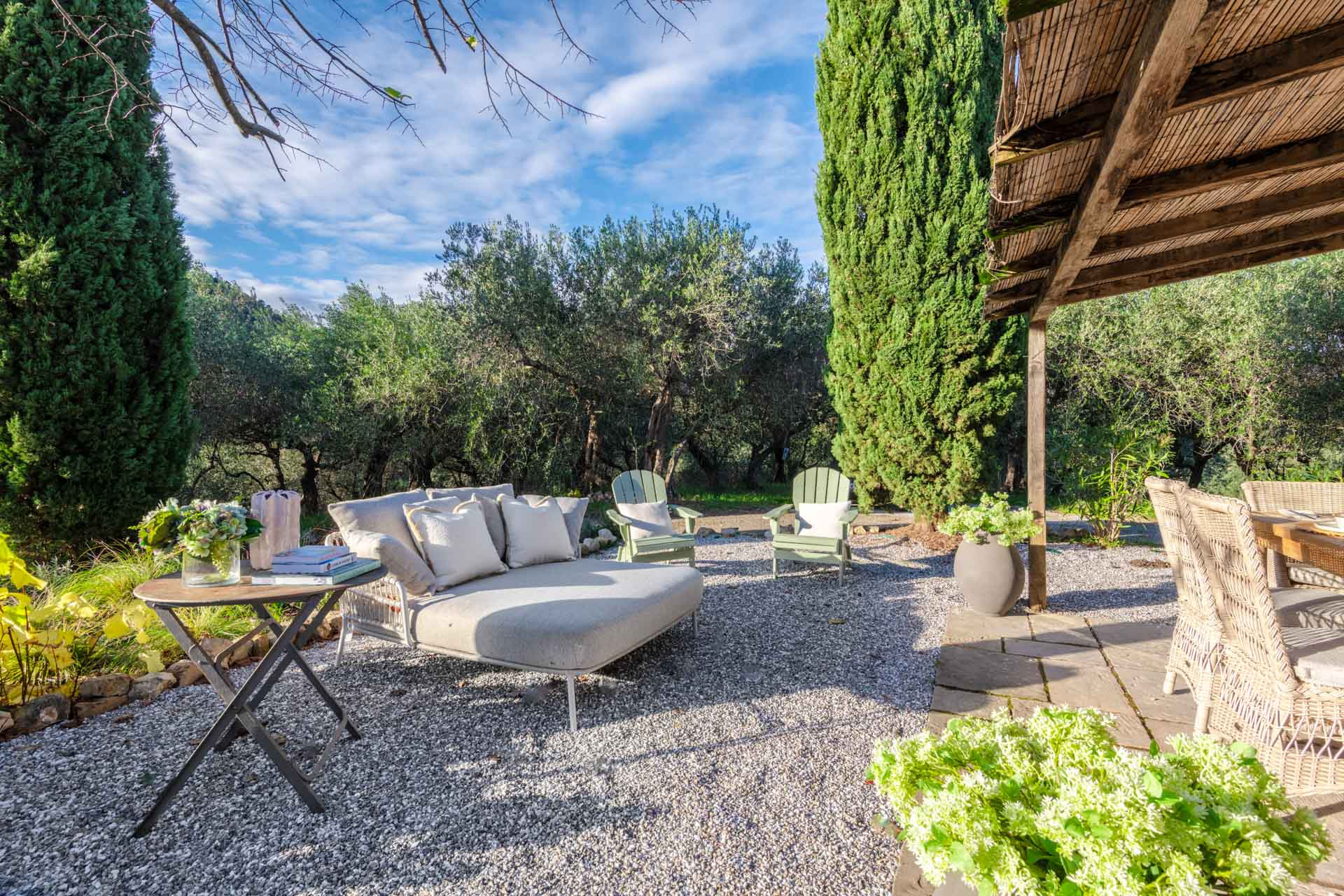 Surrounded by ancient stone walls and tall, elegant cypress trees, the cottage feels like a secret refuge. Its lovingly manicured garden is a small oasis of calm — the perfect setting for morning coffee scented with rosemary, long afternoons lost in a book, and unforgettable sunsets that paint the sky in soft pinks and fiery oranges. As day fades into evening, the landscape seems to whisper stories of centuries past.